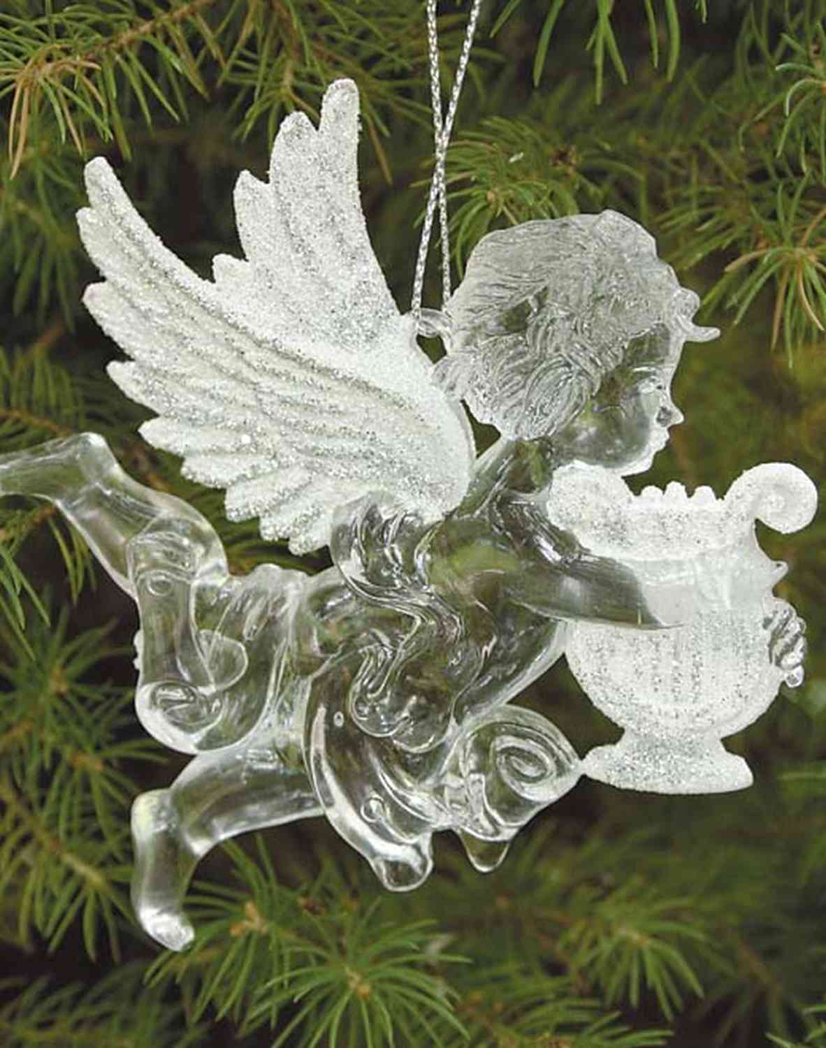 Acrylic hanging ornament Angel LINDY, 2 pieces, harp, lyre, glitter, silver-white, 3.5"x4"/9x10cm