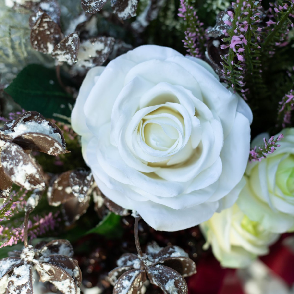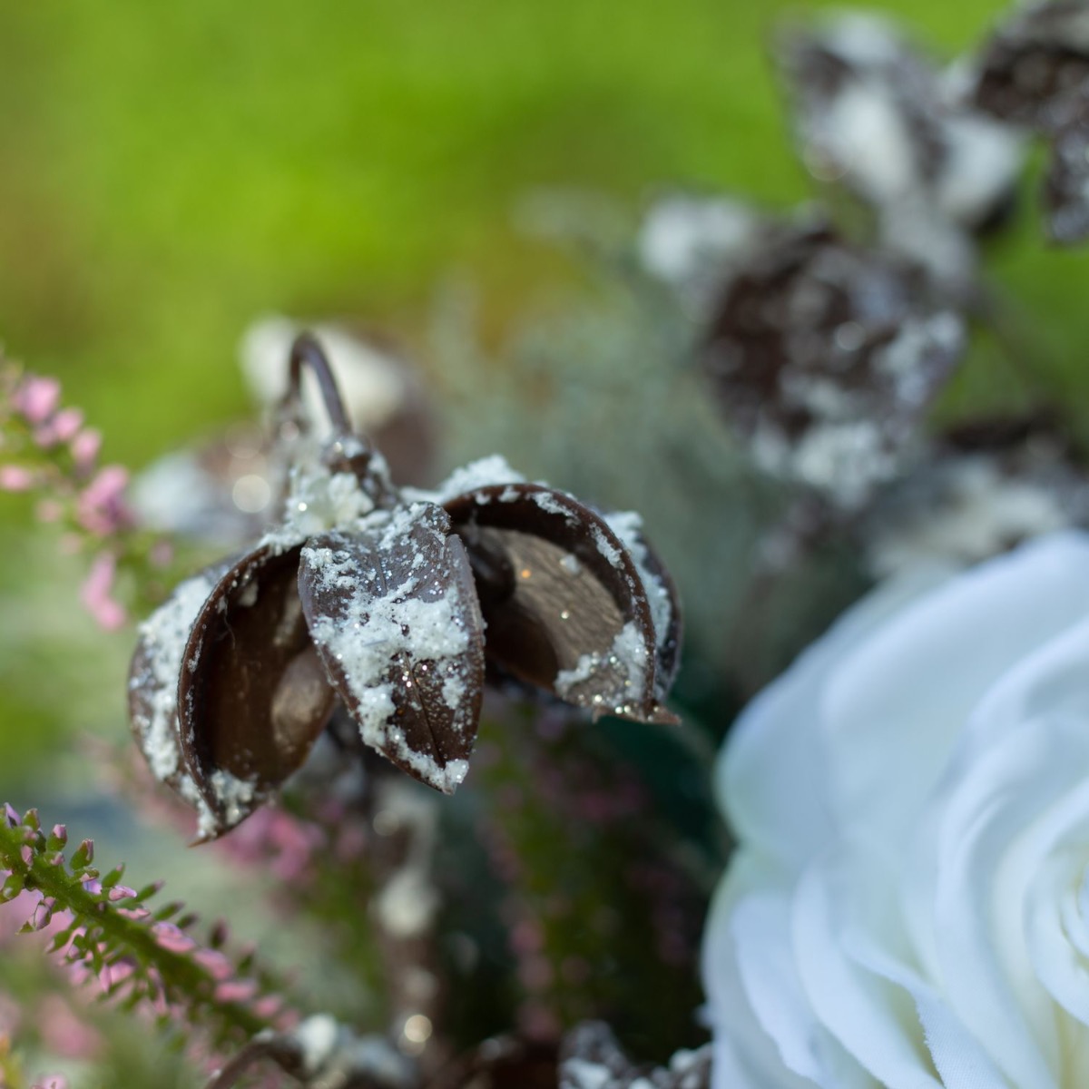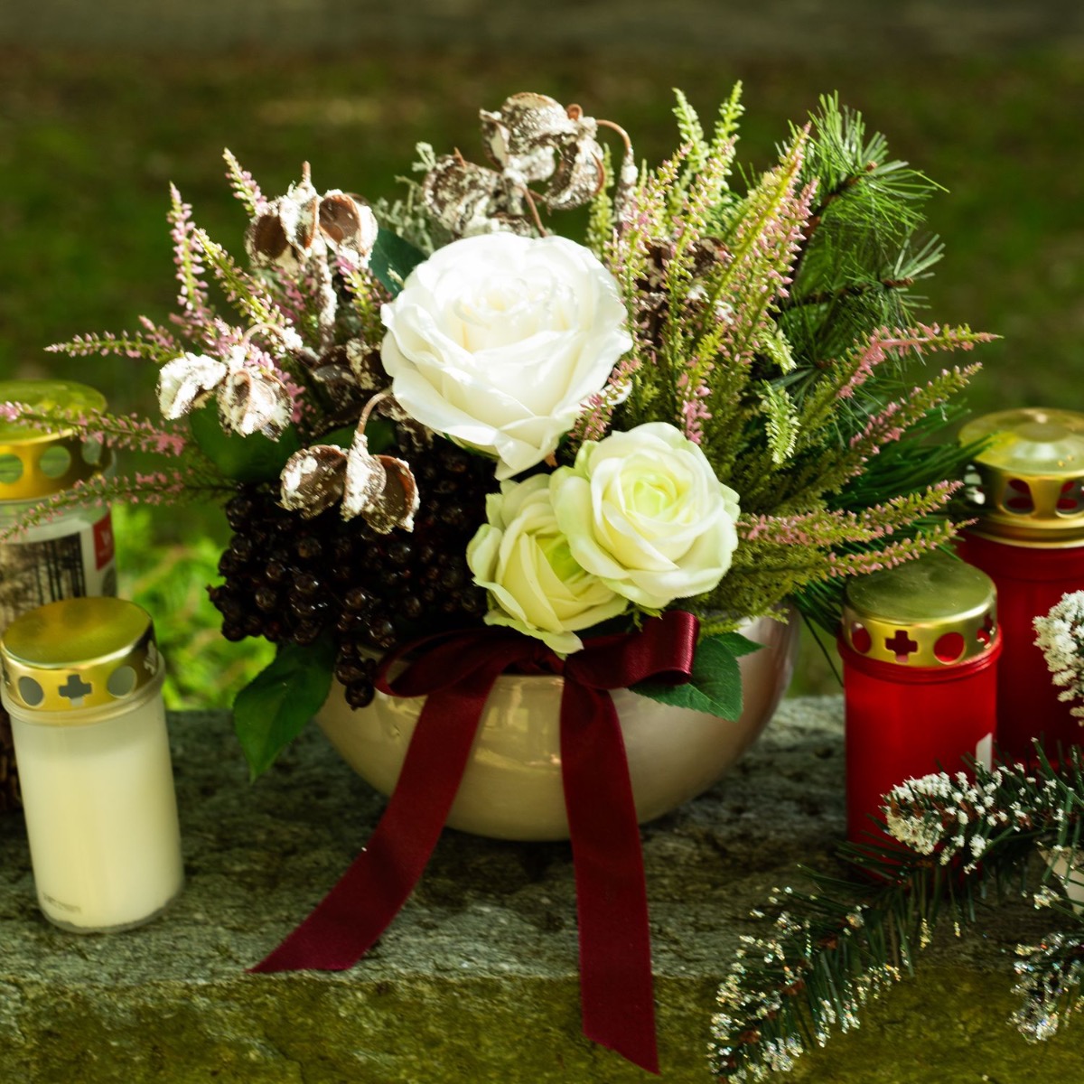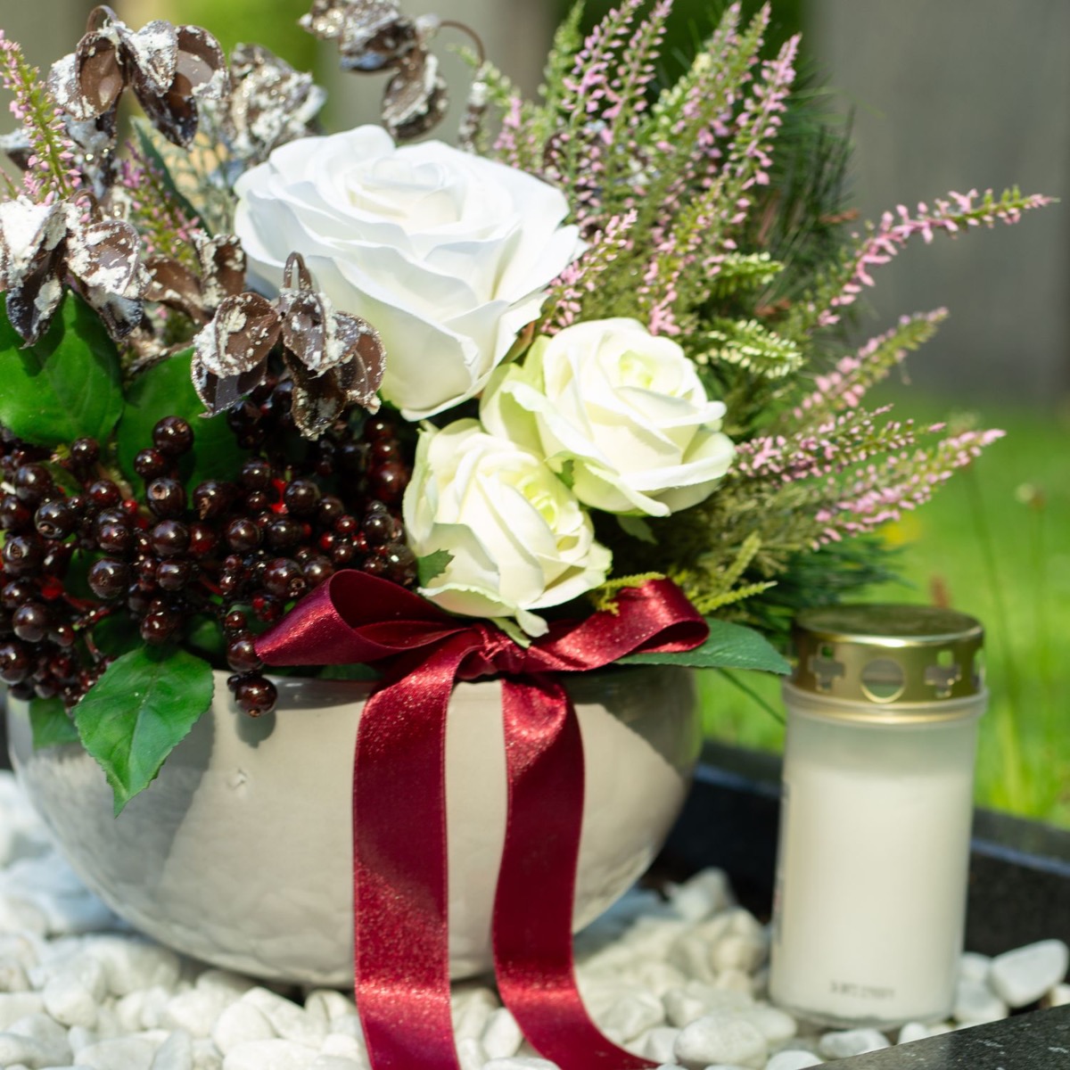The colours of grief! When you lose a loved one, life changes significantly. What remains is the memory. On All Saints' Day, we commemorate the deceased and remember wonderful times. The gravesites are tended and decorated with new flowers. It's really practical if the flowers don't fade and embellish the gravesite permanently. No wilting, no watering - and a really natural effect. A grave arrangement is a real classic on All Saints' Day. The pink-coloured heather cuttings are simply part of a cemetery arrangement, as they symbolise mourning and loss. Elderberries open the door to the underworld and white roses symbolise pure and innocent love. This arrangement not only looks beautiful, it is also a message to the deceased. Shop the look!