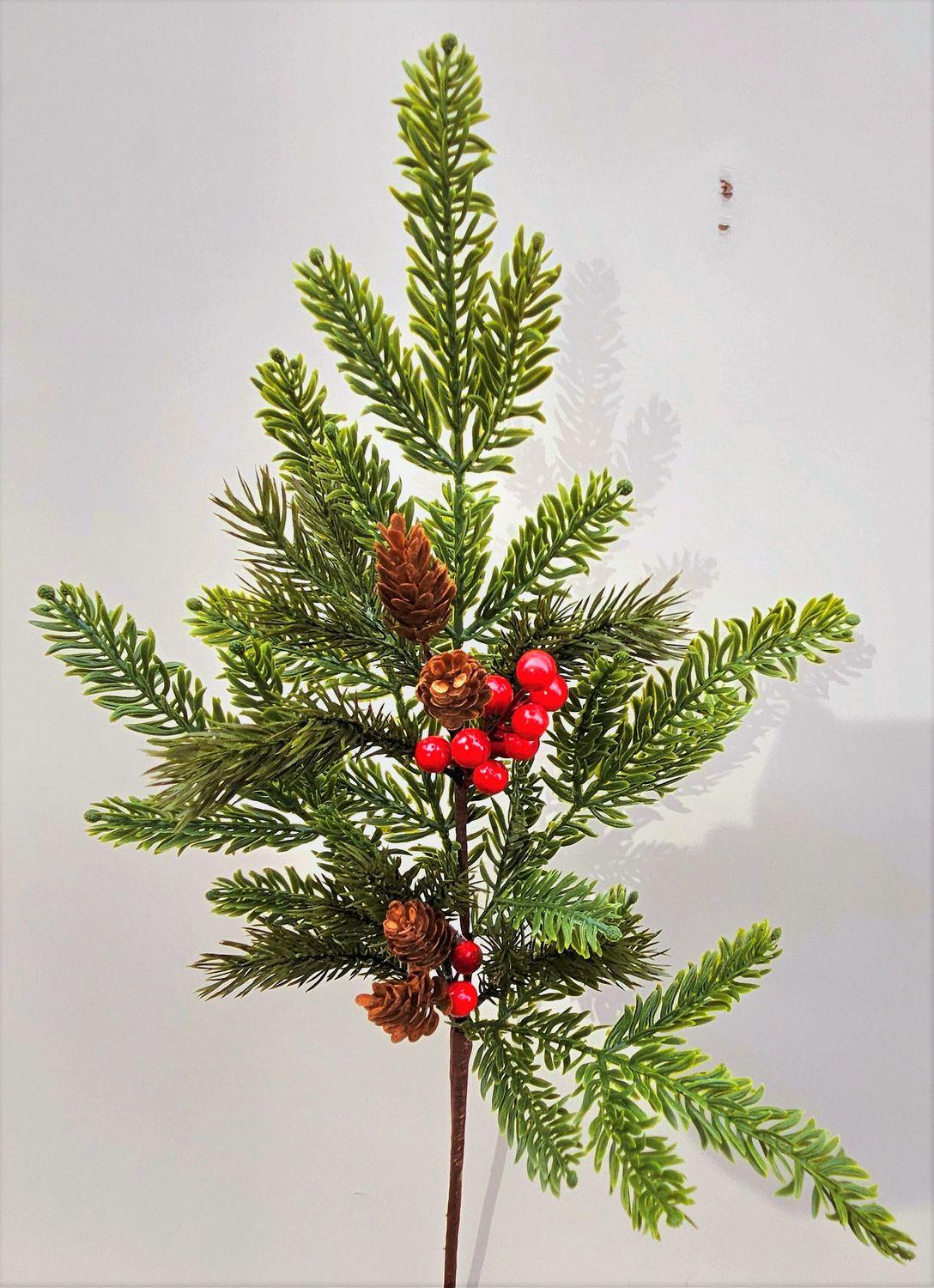 Artificial branch VARDALIA, fir, berries, cones, red-green, 30"/75cm