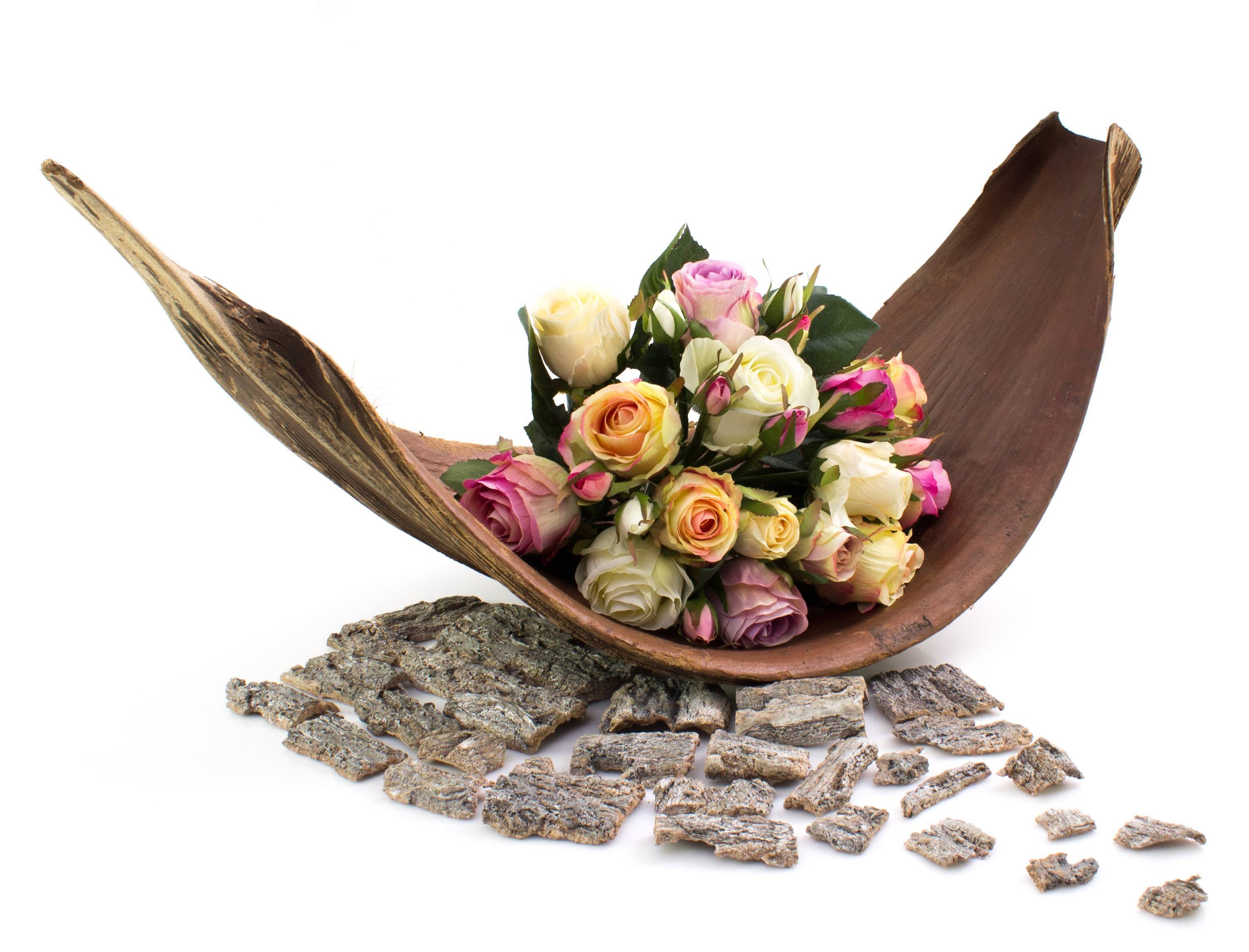 Dried loose pieces of tree bark with different sizes from approx. 1 x 1 cm to 6 x 7 cm. The natural plates with the beige-white bark surface have been lightly whitewashed and therefore look powdered as a puristic base for any decoration.