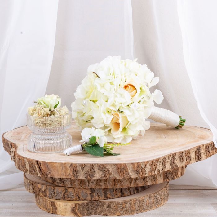 Glamorous passion! The delicate roses and cream-coloured hydrangeas blend harmoniously together and lend the bouquet a romantic touch. The pearls incorporated into the bouquet add a subtle but luxurious touch. They shine softly in the light and give the bouquet a hint of glamour and sophistication. Matching the bridal bouquet, the groom wears a buttonhole consisting of a cream-coloured rose, delicate hydrangea blossoms and a pearl. These coordinating details subtly unite the bride and groom and complete the elegant look of the wedding party. Overall, this bridal bouquet exudes an aura of romance and elegance that touches the heart and enchants the eyes. A truly enchanting companion for the bride on her way to the altar. Do you also want an artificial wedding bouquet? Shop the Look!