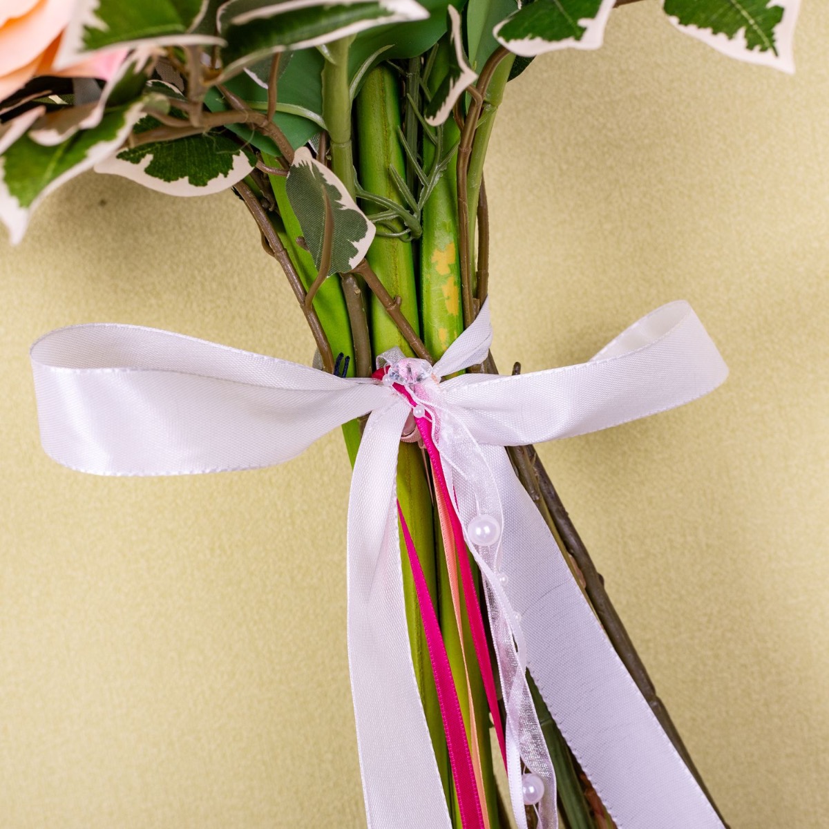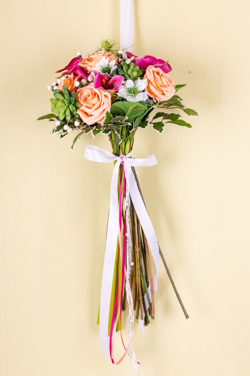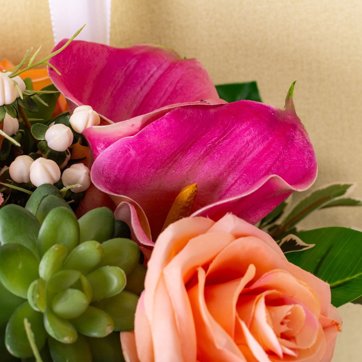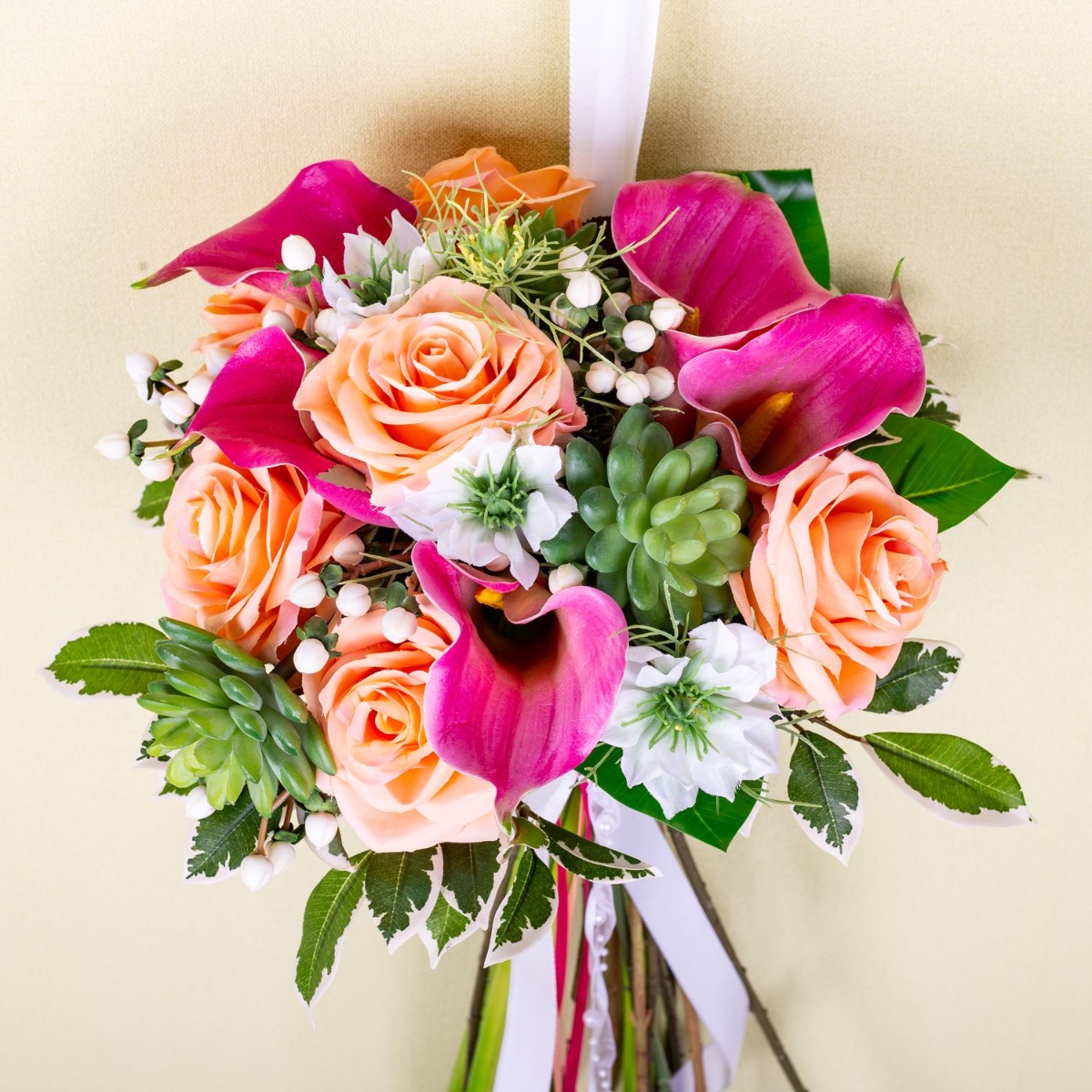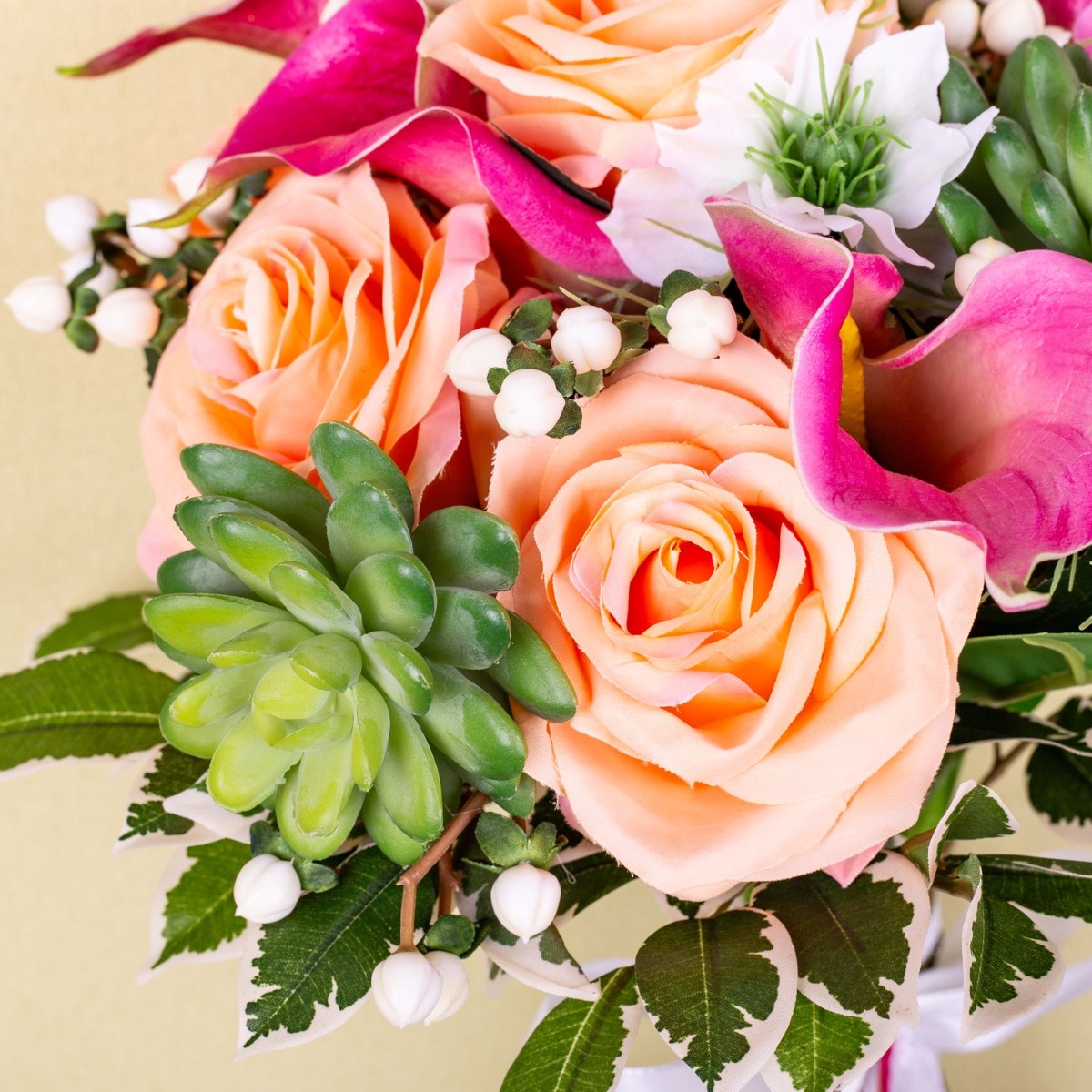 Strikingly imposing! As a surprise for Christmas, our customer Dylan thought about having his wife's bridal bouquet recreated from artificial flowers and wrote us a message. Despite the short lead time, we managed to conjure up an appealing copy made of artificial flowers. This artistic arrangement is dominated by fuchsia pink callas and apricot-coloured roses, which are the main features of this enchanting bouquet. The fuchsia pink callas, with their elegantly curved calyxes, lend the bouquet a certain grace and sophistication, while the apricot roses, with their delicate colour and full bloom, create a warm and inviting atmosphere. Succulents were added as a contrast to the delicate flowers, bringing an earthy and natural touch to the bouquet with their robust structure and lush green tones. They add texture and depth to the arrangement and provide an interesting visual contrast to the other flowers. Do you also want an artificial wedding bouquet? Shop the look!