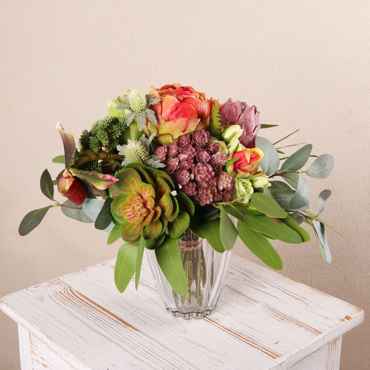 The stylish bouquet with succulents is a real statement piece. The perfectly coordinated elements of the bouquet look modern, bold and artistic at the same time. The succulents create an exciting contrast to the lush flowers, an extraordinary combination that stands out from classic bouquets. It also makes a perfect conversation starter as a gift or at a party.