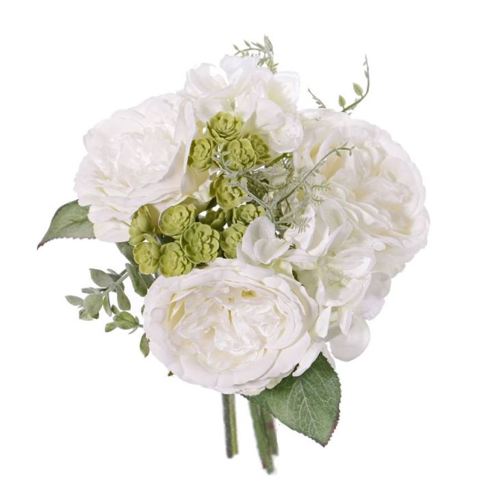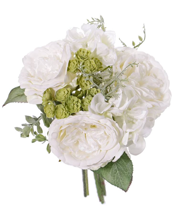 Decorative bouquet SIERRA, roses, hydrangeas, echeveria, white, 10"/25cm, Ø 10"/25cm