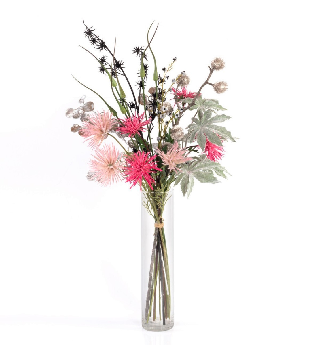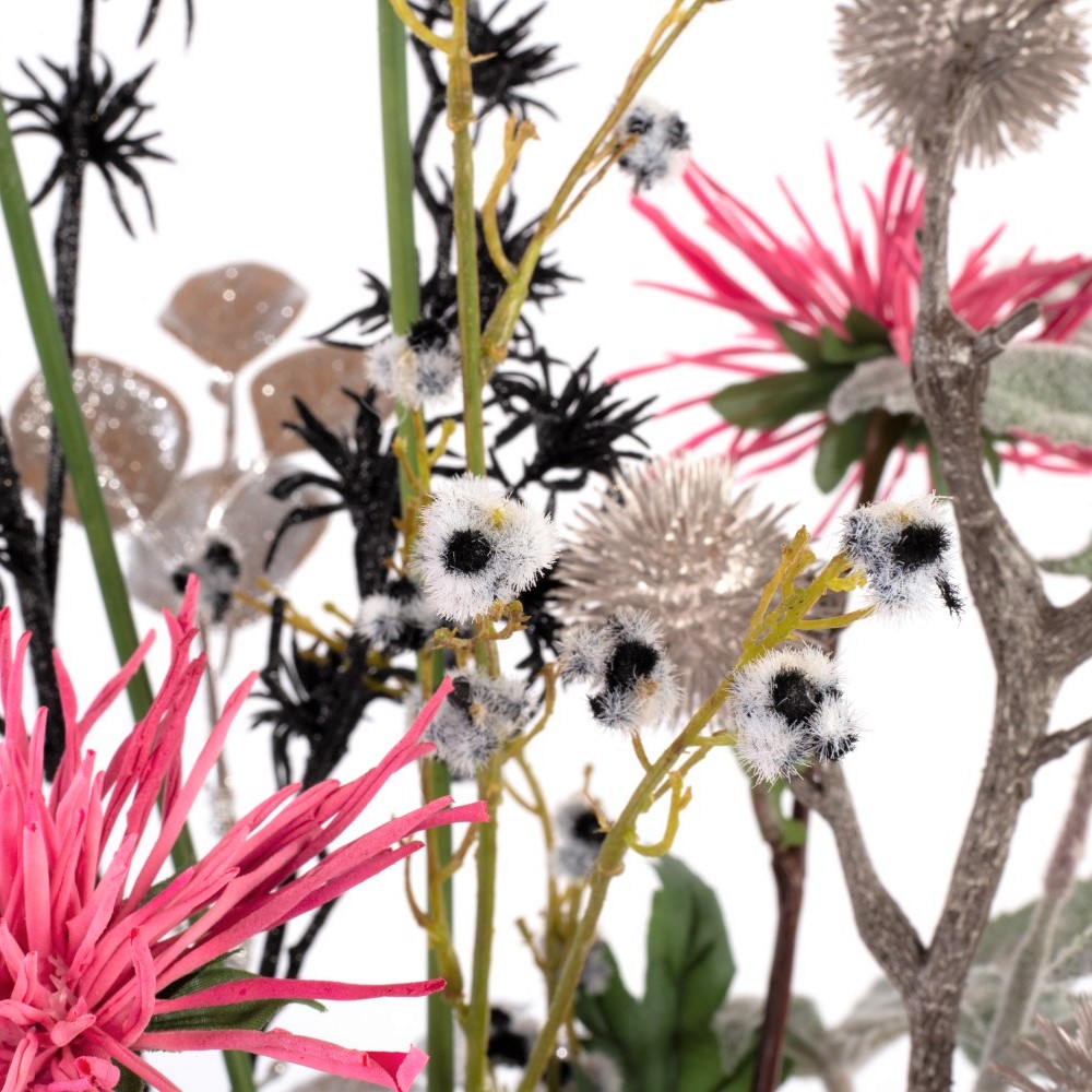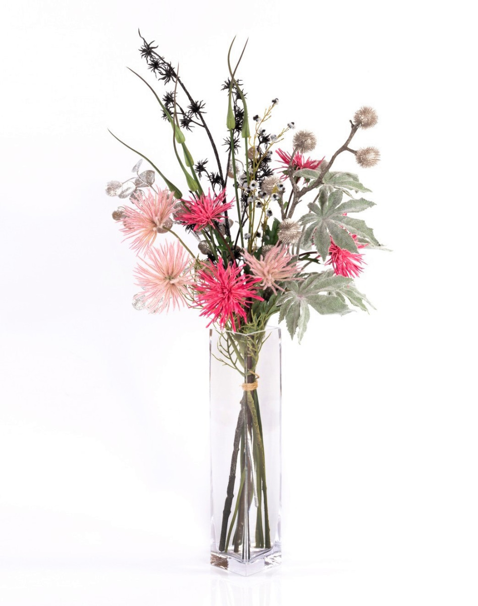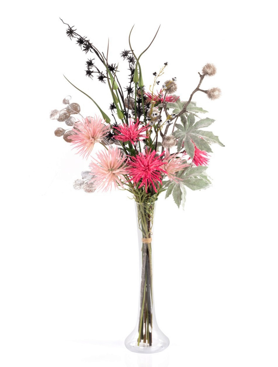 KAAMI means "happiness" in Hawaiian, an absolutely fitting name for our created New Year's Eve bouquet. The combination of the artificial flowers creates a unique firework of blossoms. Ornamental leeks that rise into the air like rockets, chrysanthemums in pink and rose create a flare and witch hazel creates a meteor shower. The floral ensemble spectacle is elegantly and festively framed with glittering silver leaf and fluffy stirlingia and papaya leaves.