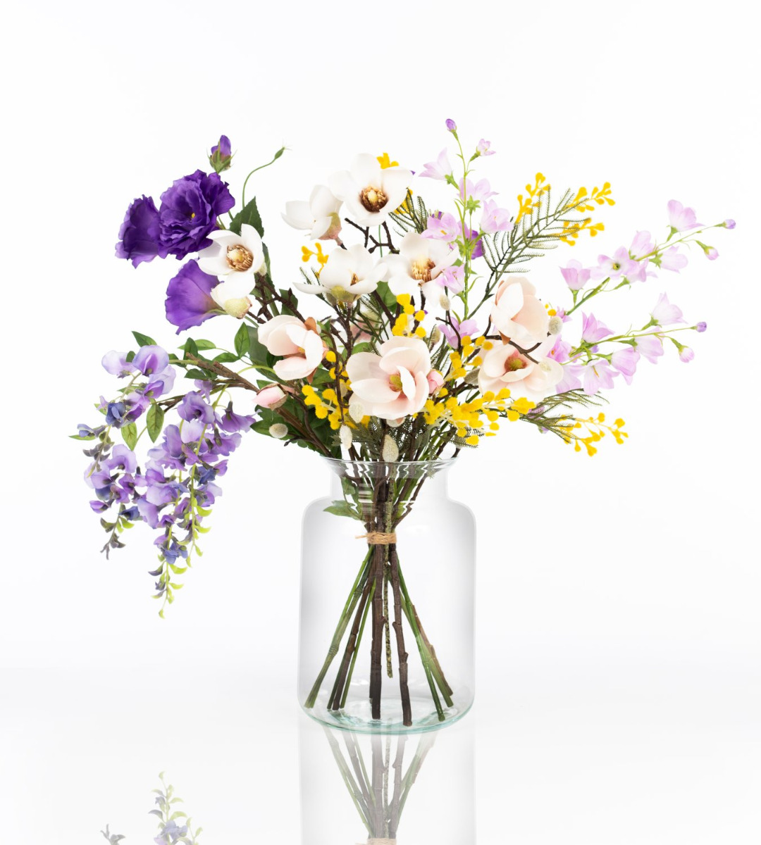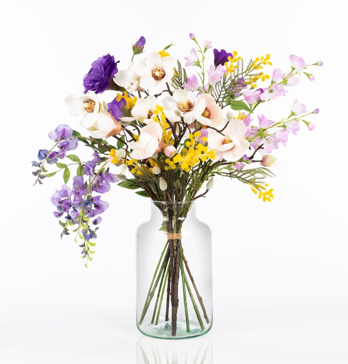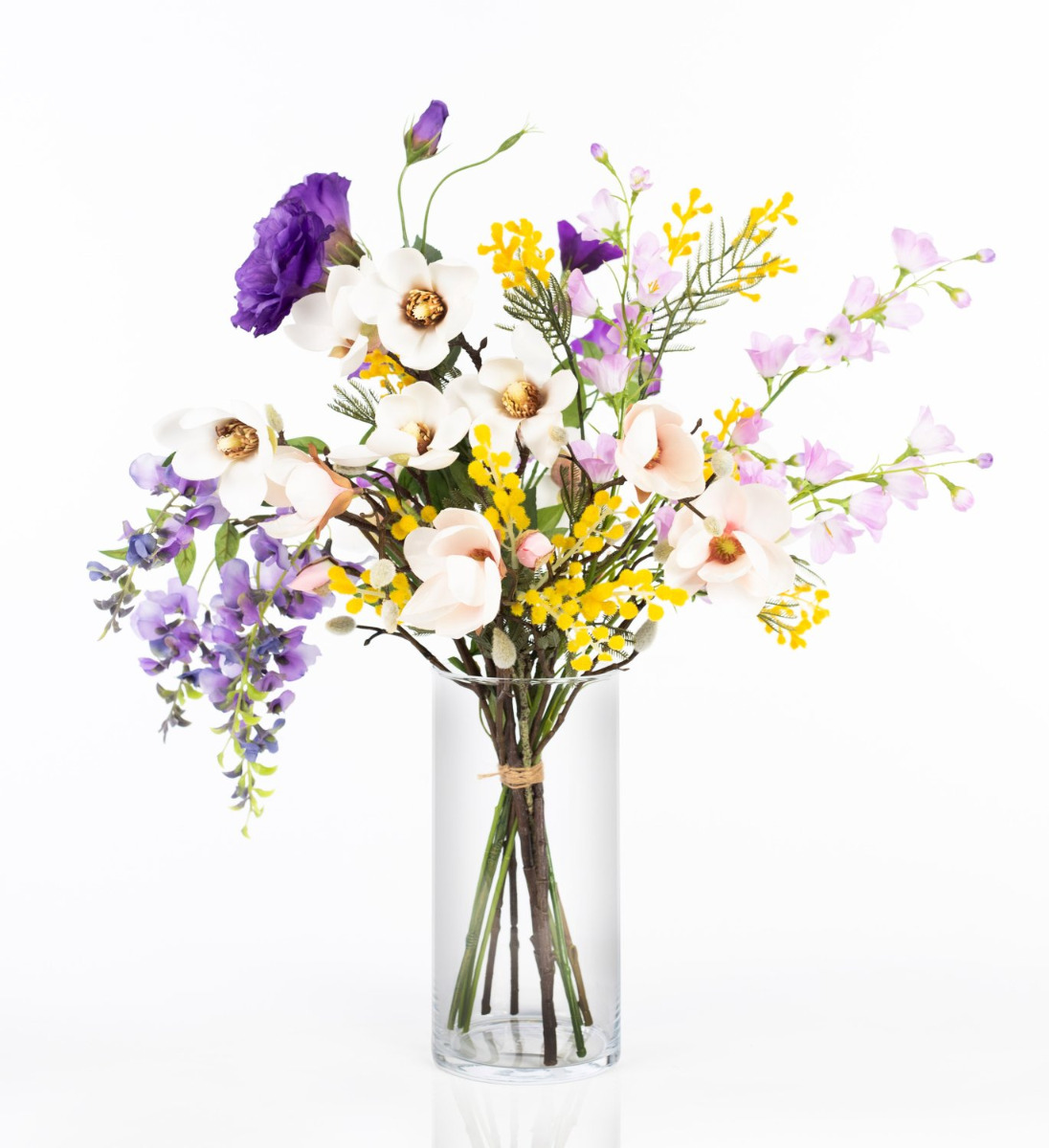 With the colourful bouquet CALISSA you will receive a flower greeting of exceptional beauty. Hanging wisteria, lush lisianthus and delicate bellflowers are complemented by delicate magnolia branches. The small blossoms of the yellow mimosa add the finishing touch to the bouquet, peeking boldly out from between the large flowers.