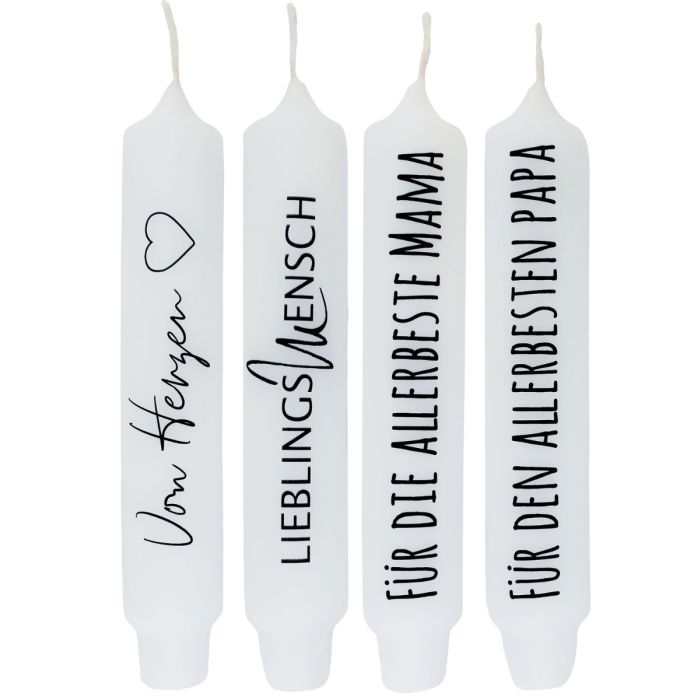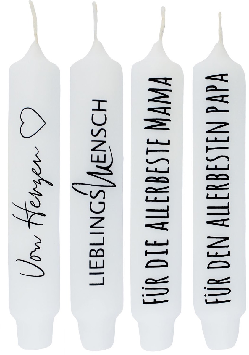 - In colour white with black lettering, 4 candles in total with different sayings in German