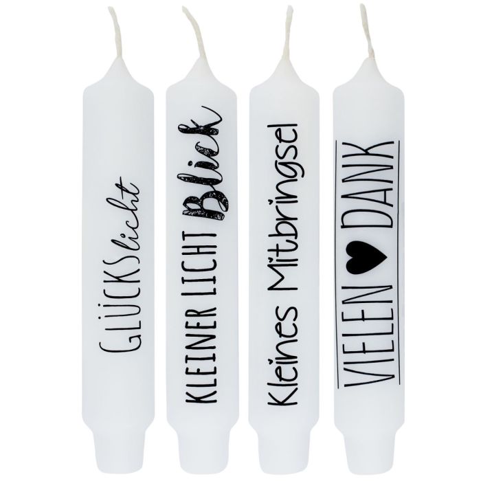 - In colour white with black lettering, 4 candles in total with different sayings in German