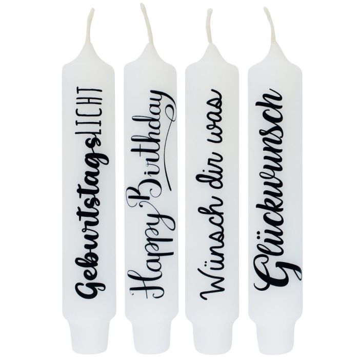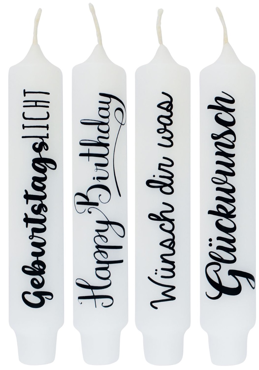 - In colour white with black lettering, 4 candles in total with different sayings in German