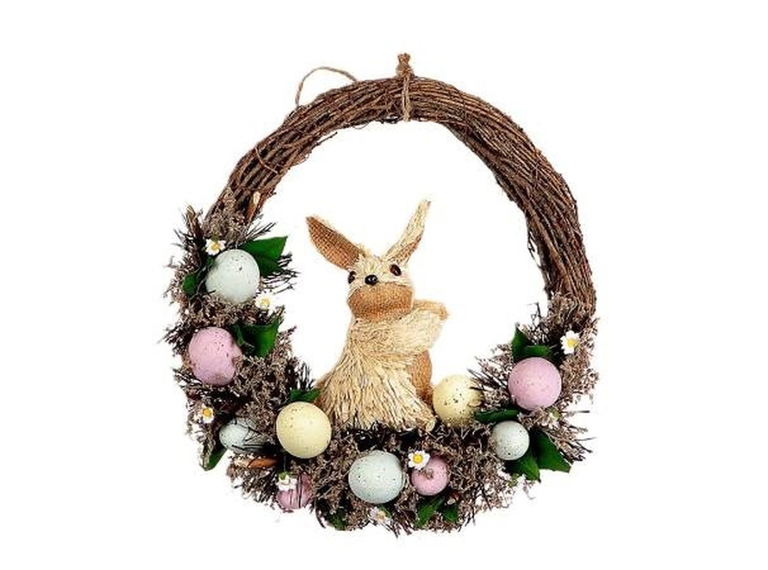 Easter decorative wreath NANOUK with bunny, eggs, flowers, brushwood, pink-blue-yellow, 3.3"/8,5cm, Ø13"/34cm