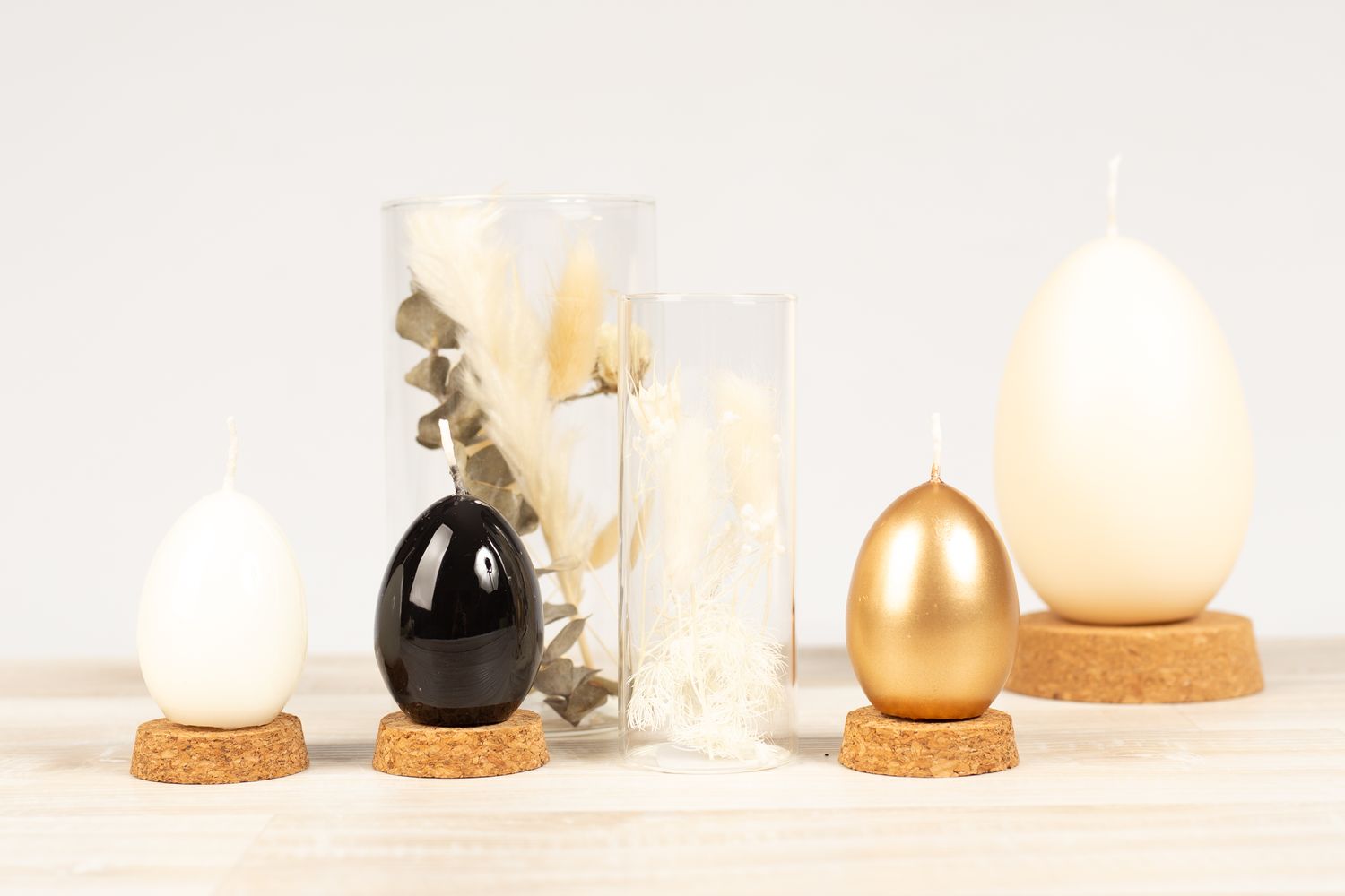 Gold and black! With these colours, you don't first think of Easter and spring. In view of the noble look, you really feel like going on the annual egg hunt. Different sized Easter egg candles in a noble design with a gold lacquer or an incredibly shiny black lacquer. To match, we have selected two products from our dried flower range. Tubular glasses, filled with dried flowers, are totally modern at the moment and underline the noble look of the egg candles. Have a wonderful Easter time! Shop the Look!