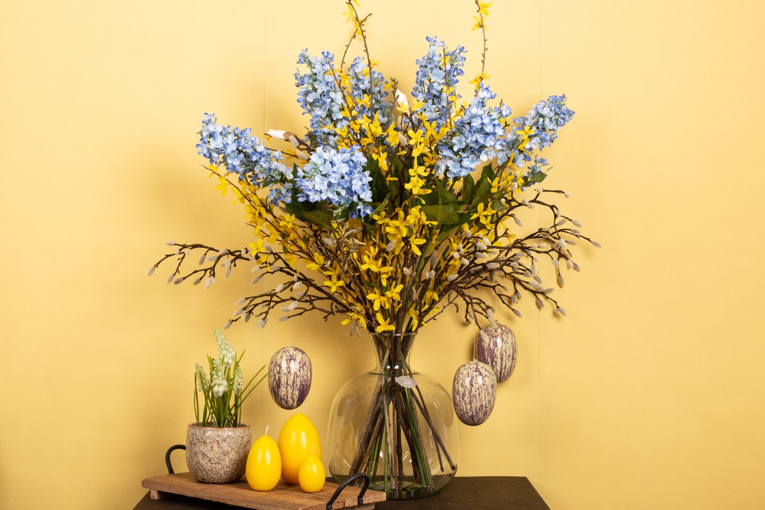Plain and natural! The long winter is finally over and the first rays of sunshine conjure up the first blossoms in nature. At last it is getting warm again! The magnolias and birch twigs look like they were picked by hand and are perfect for hanging a few Easter eggs on. White hyacinths are really rare to see in nature. Here they go particularly well with the white fluffy buds of the magnolia. We have extended this look with 5 yellow forsythia branches and blue lilac. Let the Easter egg hunt begin! Shop the look!