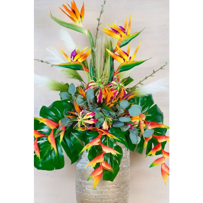Modern large orange coloured bouquet! We received a request from Bastian for the design of a business space. As guideline we had the colour request as well as the desired measurements of the bouquet. A picture of the room and of the amphora intended for the bouquet should help us to make a suitable selection of flowers. So we could decide freely on the orange colour spectrum. The room itself looked very clean and cool due to the anthracite-coloured floor and some chrome elements. The deciding factor for the colour choice was a wall painted orange in contrast to the rest of the room. We searched for suitable flowers in our online shop as well as in the warehouse. To find the perfect bouquet for the client, we created three different variations. The client chose the strelitzia bouquet we offered. After small adjustments and the wish for more fullness, the ensemble met his expectations. Whereupon we received the order. Do you also want an artificial extravagant bouquet? Shop the Look!