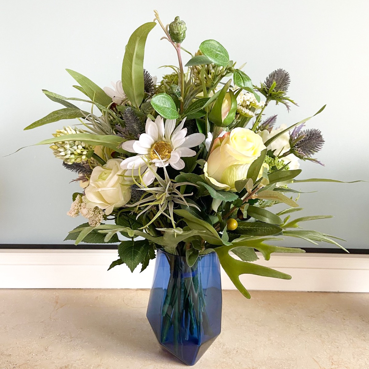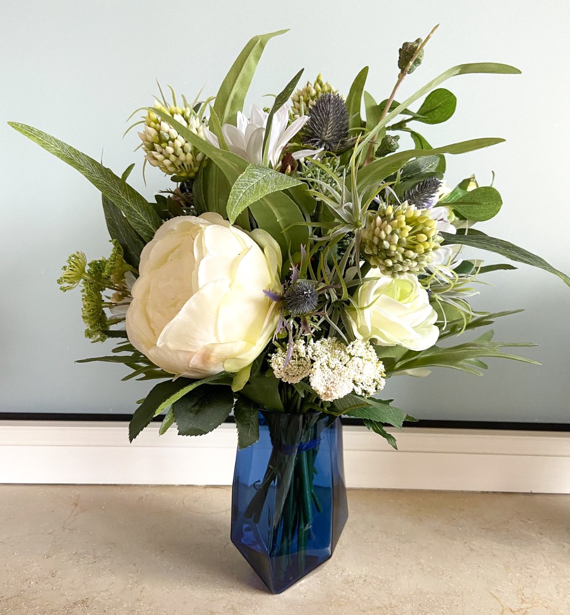 Wedding on a Cruise! Who wouldn't want to get married in a holiday paradise or on the high seas? To make this experience a reality, a cruise ship company commissioned us to realise the artificial floral decorations in case no fresh flowers are available. They needed two different-looking bridal bouquets with matching table arrangements for the wedding table. As a point of reference, the customer told us that he liked the two already realised customer requests "Exclusive hydrangea arrangement - customer request from Hans Peter" and "Exclusive bridal bouquet and buttonhole - customer request from Elisabeth". We used these two pink looks again as a small bridal bouquet and also designed a modern white version. The decision was made in favour of the customer request "Exclusive hydrangea arrangement - customer request from Hans Peter" as a modified bridal bouquet version and our newly created white wedding bouquet. For the pink version, we also created an additional arrangement in an oval bowl with exactly the same flowers and the white bouquet also received a matching arrangement in a round bowl. The two bridal bouquets were finished off with a white ribbon around the stems to make them comfortable to hold in the brides' hands. Since two cruise ships were allowed to be equipped with the artificial flowers, we sent the whole thing to the shipping company in a double pack from where our flowers are now travelling the world. Would you also like such a beautiful flower ensemble? Shop the look!