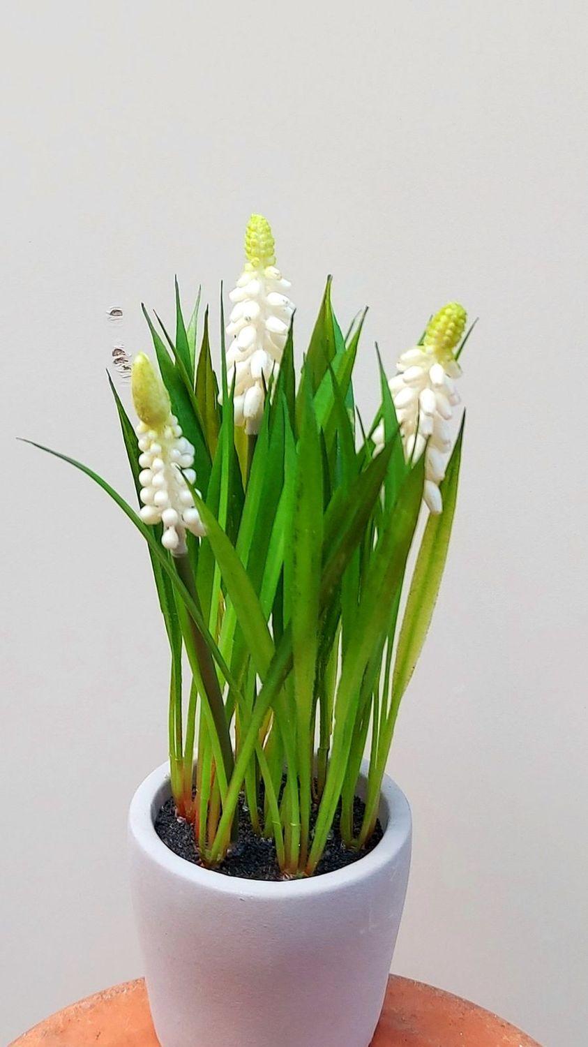 Fake flower Grape hyacinth NARMADA in a cement pot, white, 8"/20cm