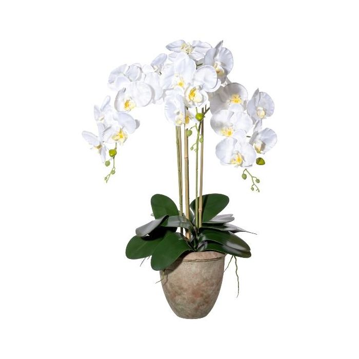 False Phalaenopsis orchid FRIMTOR in terracotta pot, roots, white, 30"/75cm