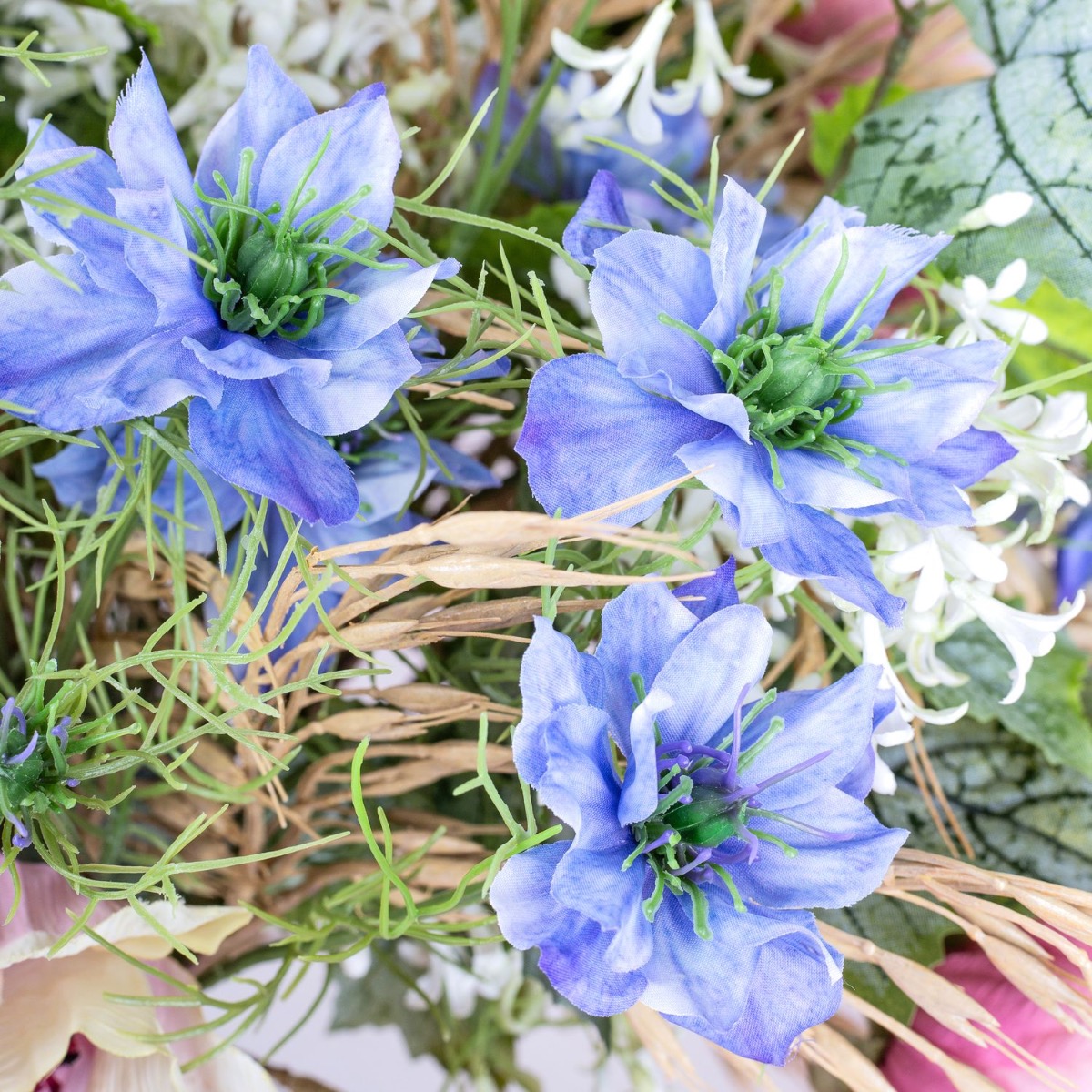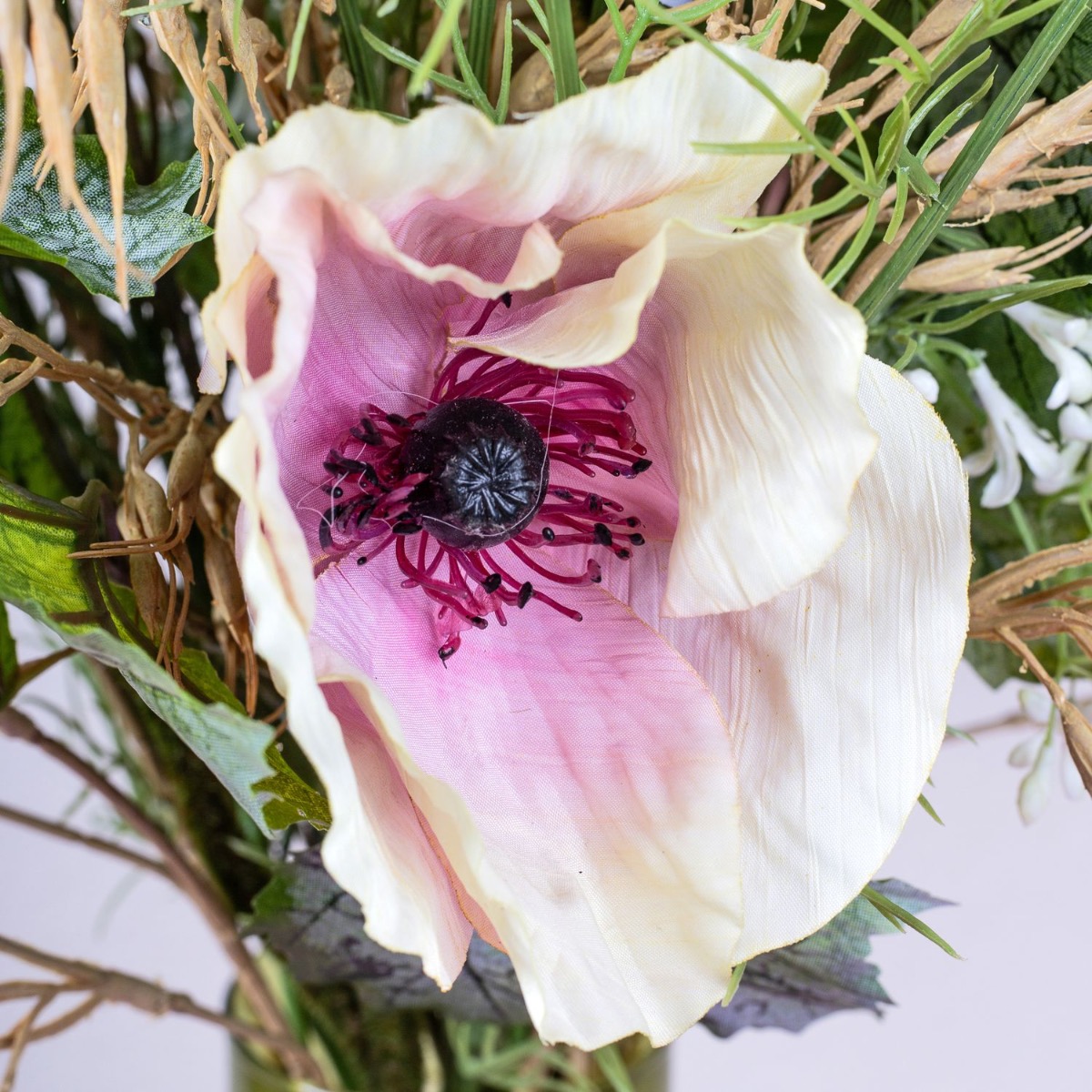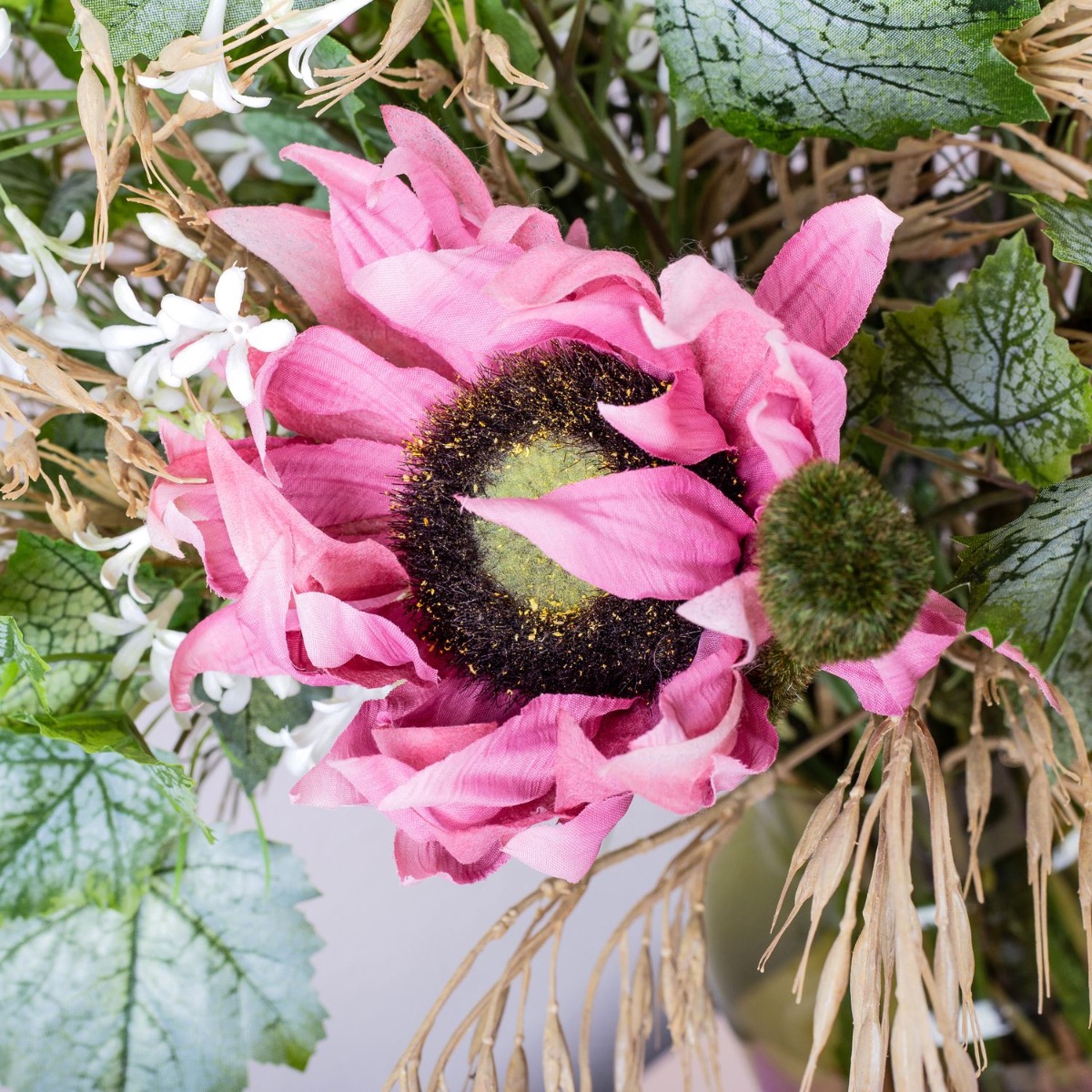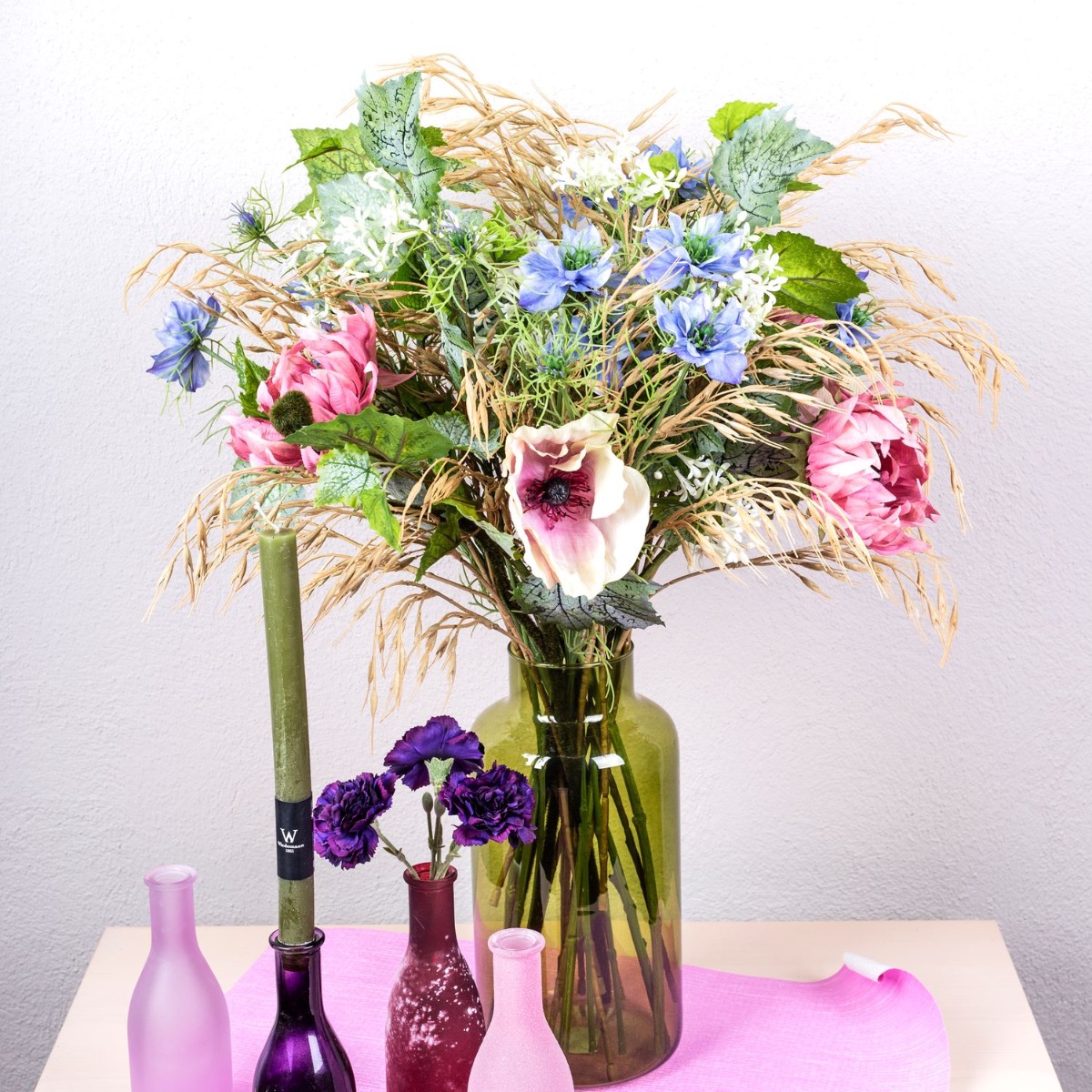 Colourful summer breeze! A wonderful bouquet of field flowers, put together with great attention to detail, evokes the warm summer air and the lightness you feel when you walk across a flower meadow. Pink poppies and sunflowers, as well as blue cornflowers have been combined with false oat-grass twigs and vine leaves. Just as if you had picked it yourself. This look embodies pure romance! You just have to fall in love with it! Shop the Look!