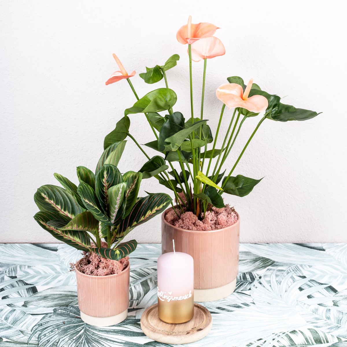Pink and exotic plants! It doesn't always have to be a bouquet of flowers if you want to make a loved one happy. The pink flamingo flower has been enhanced with a matching planter and our versatile natural moss. This look also suits the arrowroot and brightens up our arrangement. The candle not only adds to the atmosphere, it is also a compliment to the recipient. Who wouldn't want to be someone's favourite person? A year-round look that brings exotic freshness into your home. Shop the Look!