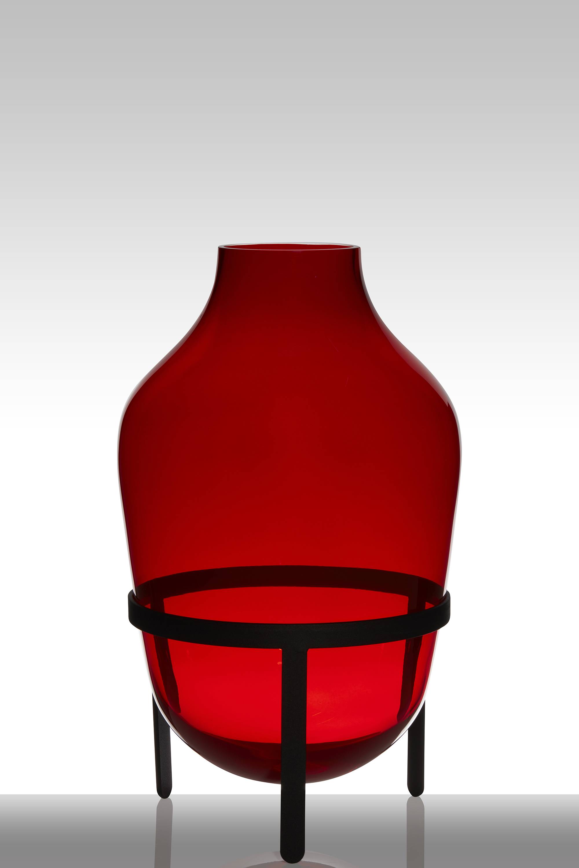 The high vase/glass vase CAMILO in red and the dimensions 50cm; Ø29cm by INNA Glas can be used in many areas and is provided with large decorative branches or similar, a real eye-catcher!
