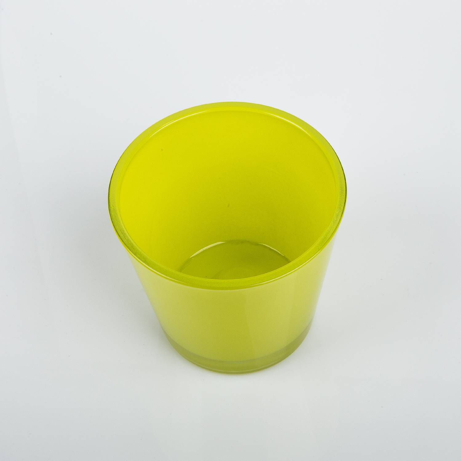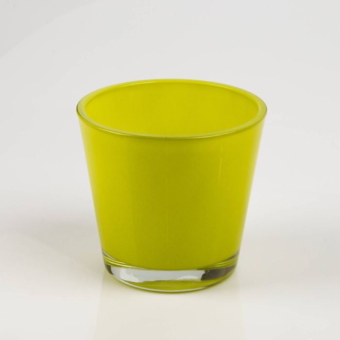 Massive flower pot or tea light holder RANA of glass measuring 3.94" x 5.12" x 5.51"/10 x 13 x 14 cm by INNA Glas. In this yellow-green decorative glass will not only feel your XXL tea light comfortable, but also numerous potted plants will create the perfect ambiance for your rooms.