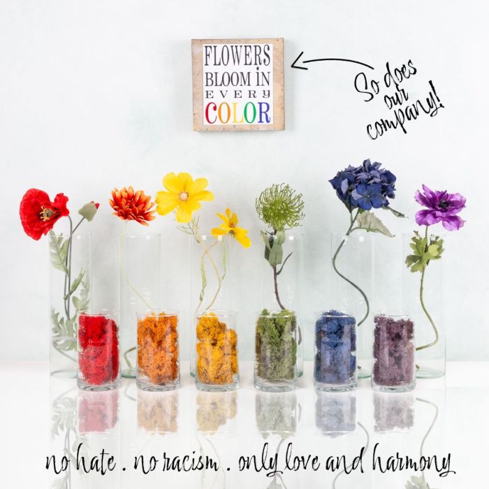 In the colours of the rainbow – as diverse as our team! Our world is colourful, and this is reflected not only in our colourful range, but also in the people behind artplants. Diversity is a natural part of who we are – regardless of origin, love or faith. The bright colours of the flowers harmonise perfectly with the moss-filled glass in the foreground and show that beauty arises where colours and people meet. Shop the look!