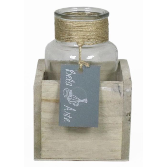 Glass bottle LORRIE in wooden box, clear, 3.5"x3.5"x5.1"/9x9x13cm