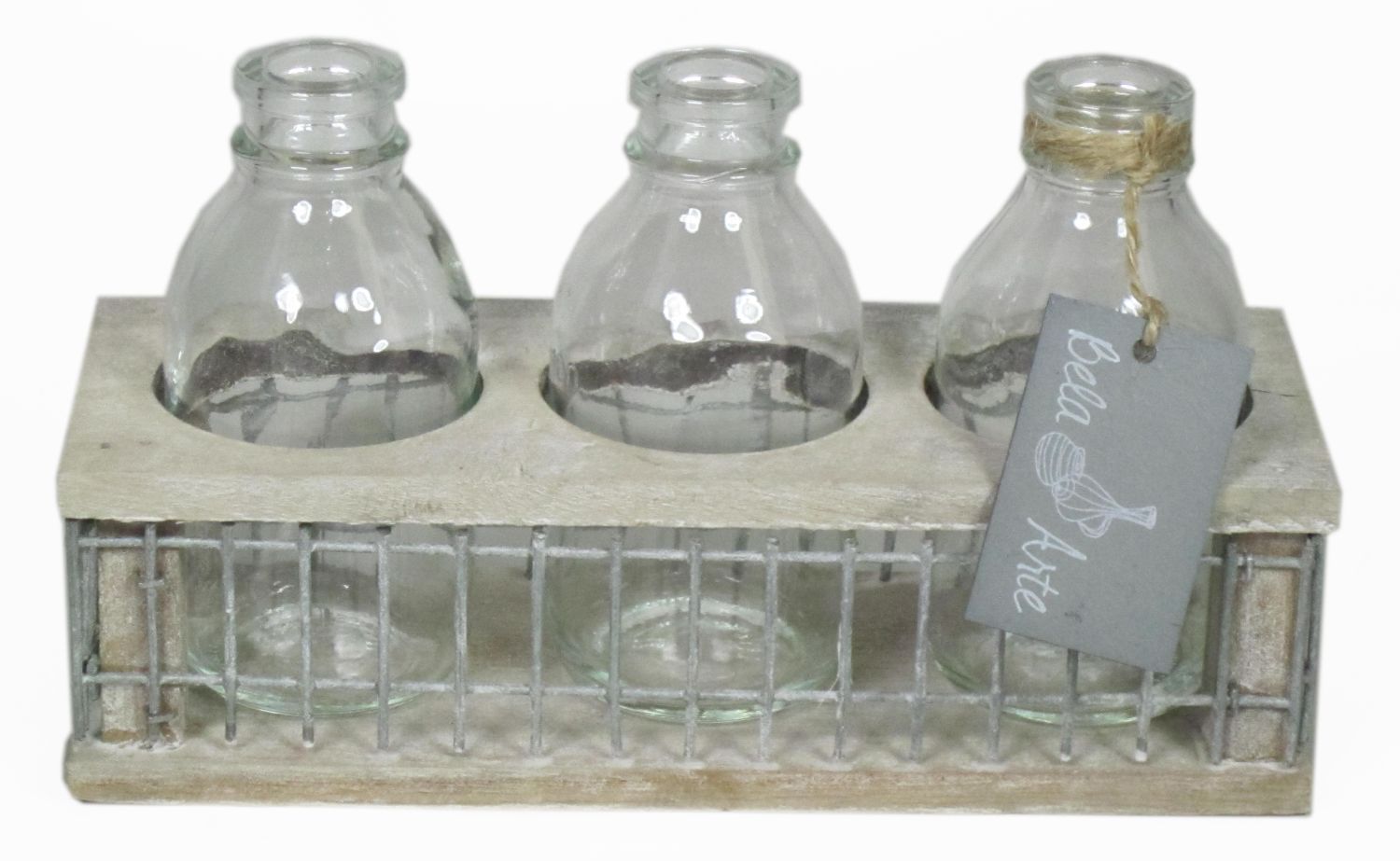 Glass bottles LEATRICE OCEAN in wooden box, 3 glasses, clear, 8"x3.1"x4.3"/21x8x11cm