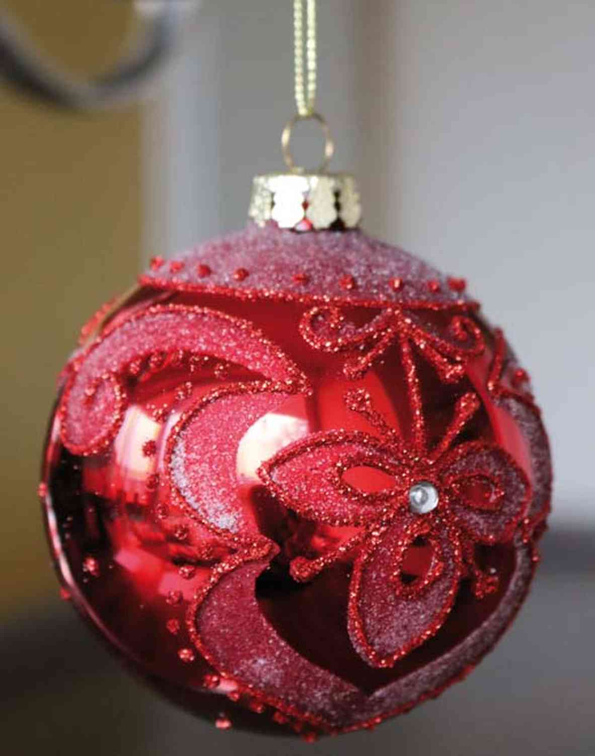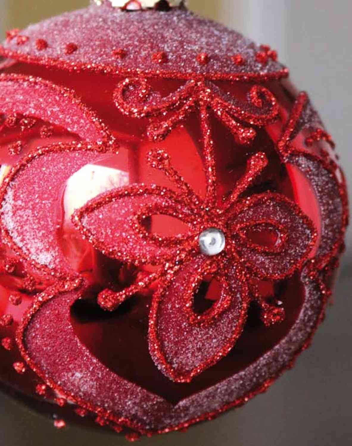 Red Christmas tree ball CAROLINE with pretty floral tendril decor. The Christmas ornament will decorate your Christmas tree festively and has an overall diameter of approx. 8 cm.