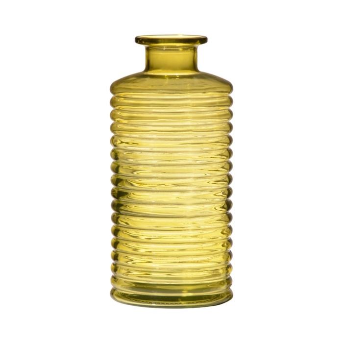 Glass decor bottle STUART with grooves, yellow-clear, 8"/21,5cm, Ø3.7"/9,5cm