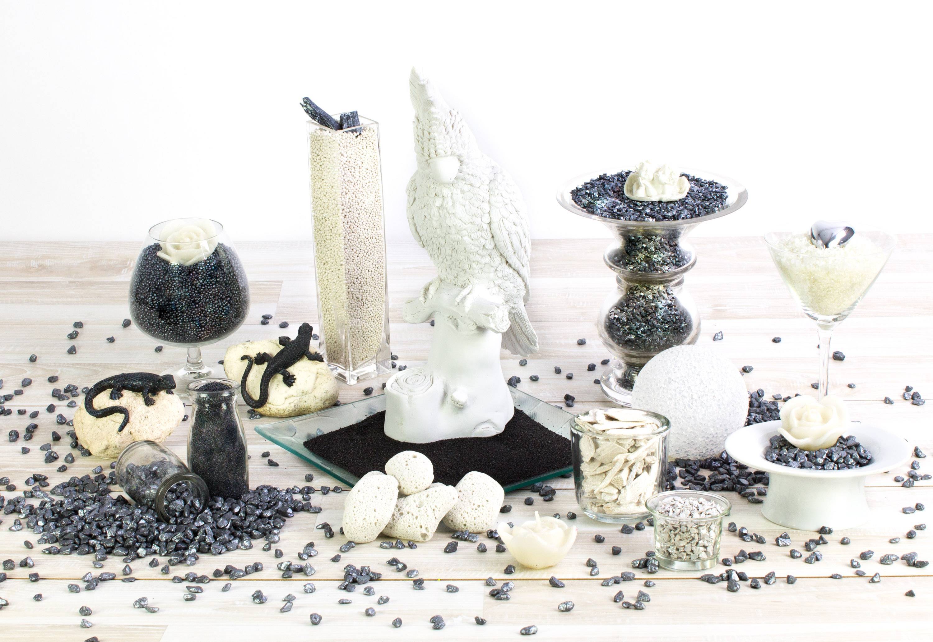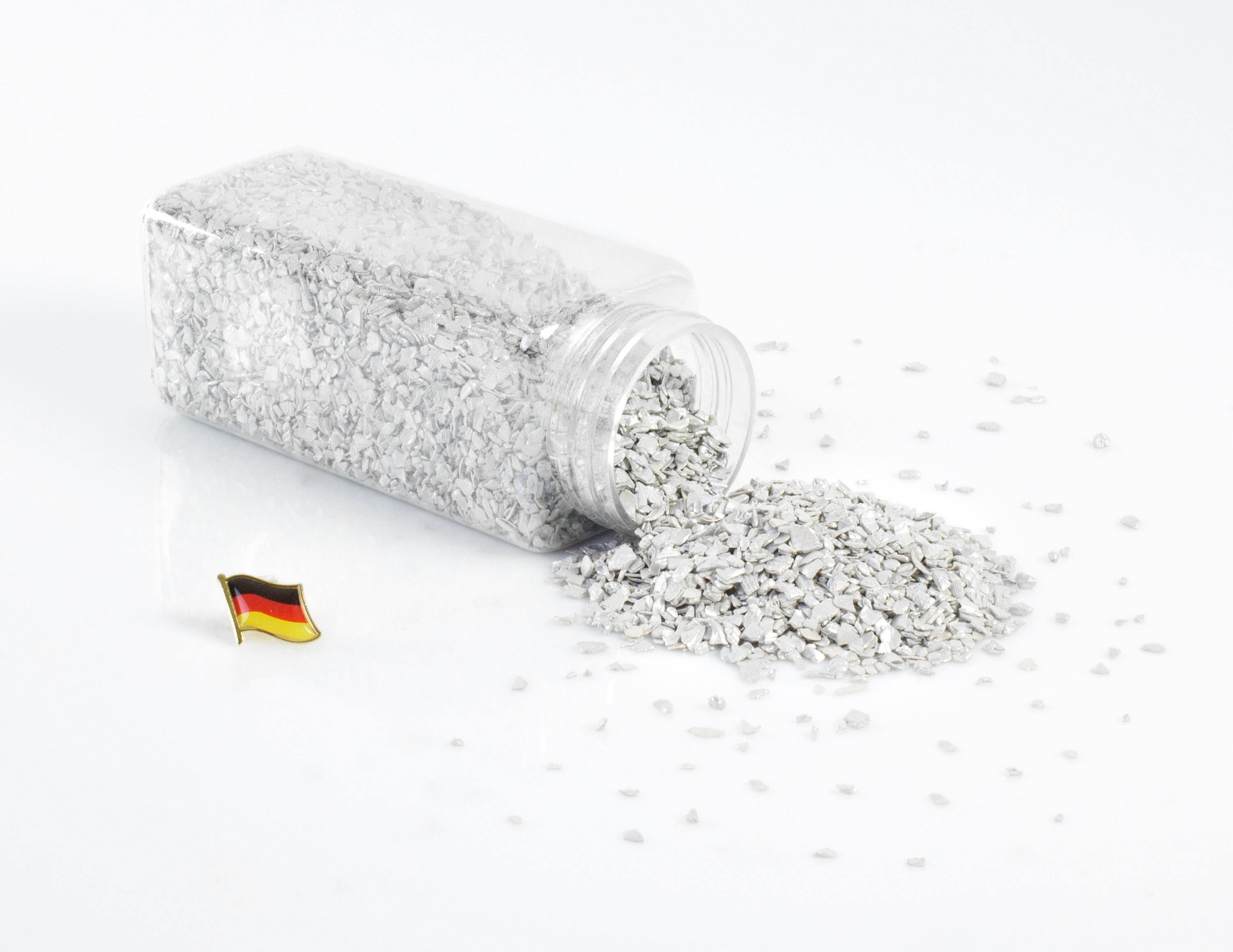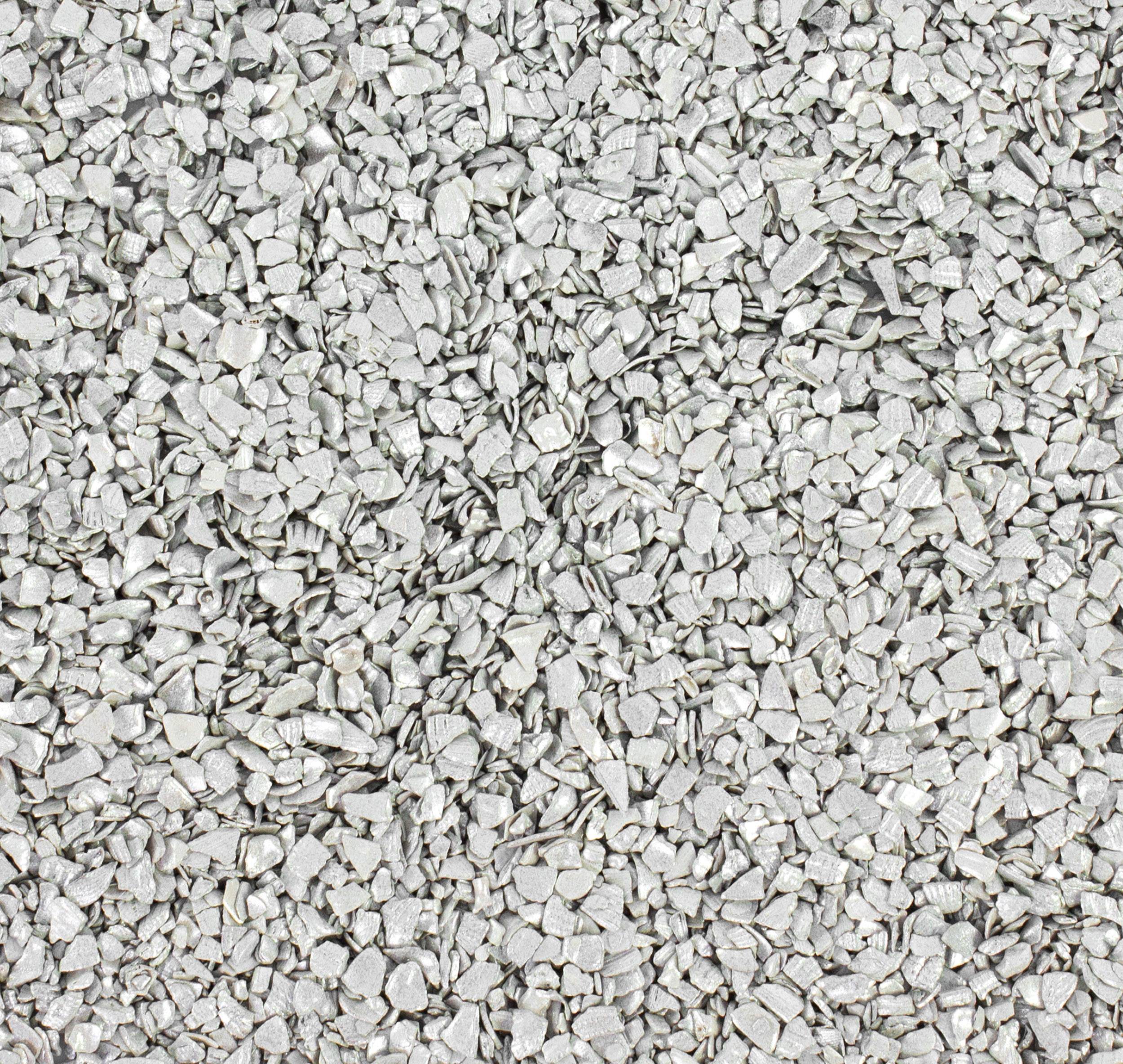 - Small broken bits of seahells coloured in pigment colour glossy light grey, this colour is harmless to animals and plants