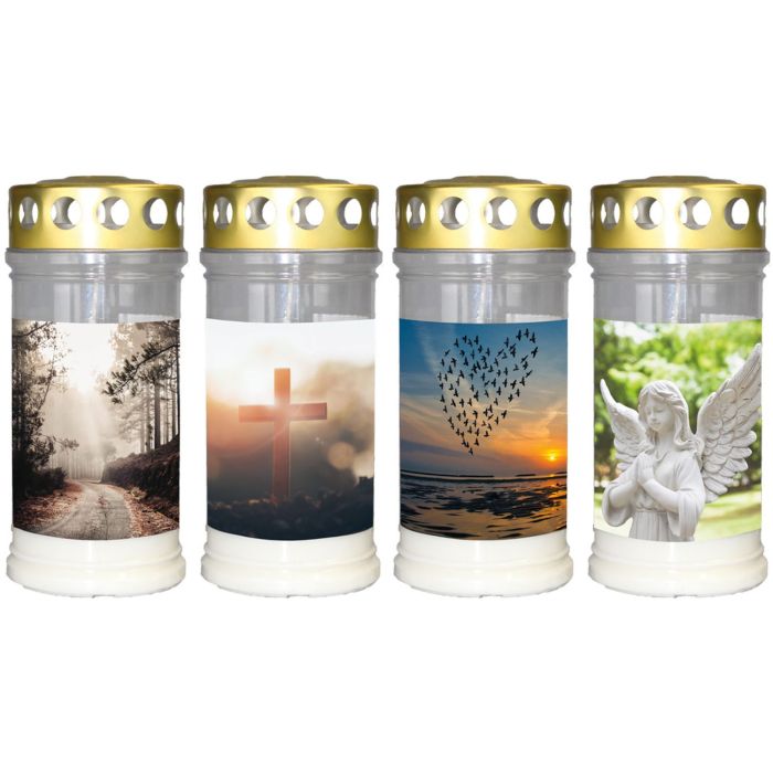 Grave light SAVINA with motif, lid, 4 pieces, white, 6.7"/17cm, Ø 3"/7,7cm, 96h