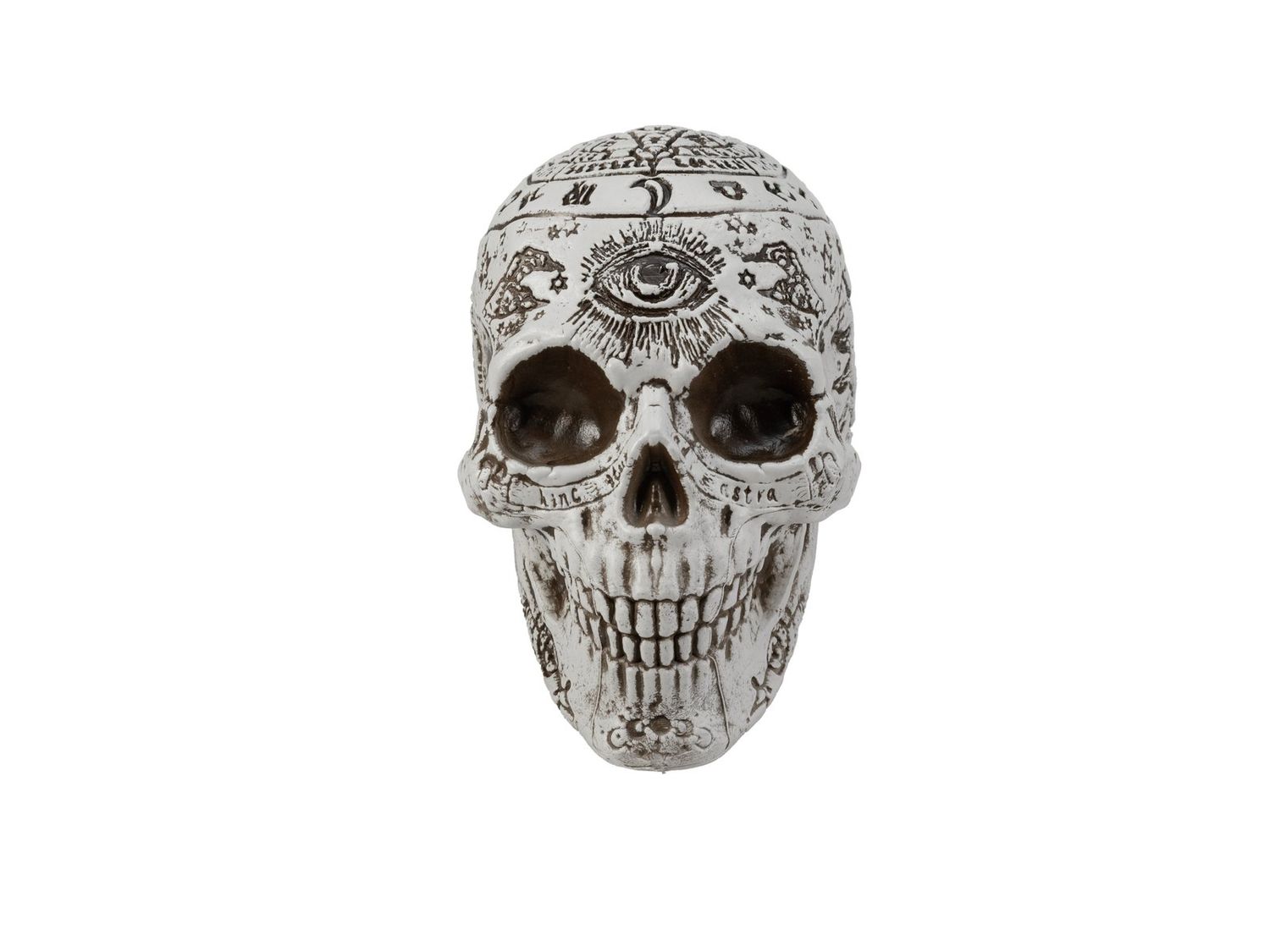 Creepy skull FARALDA with mysterious runes and symbols, each of these curves and lines seems to be charged with special powers and magic. What mysteries and stories does the skull hide? Does it come from the world of the Mayans, the Druids or perhaps a sorcerer?