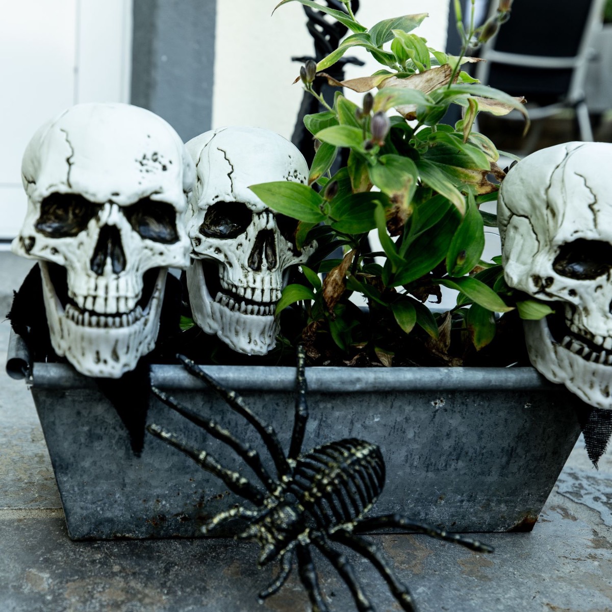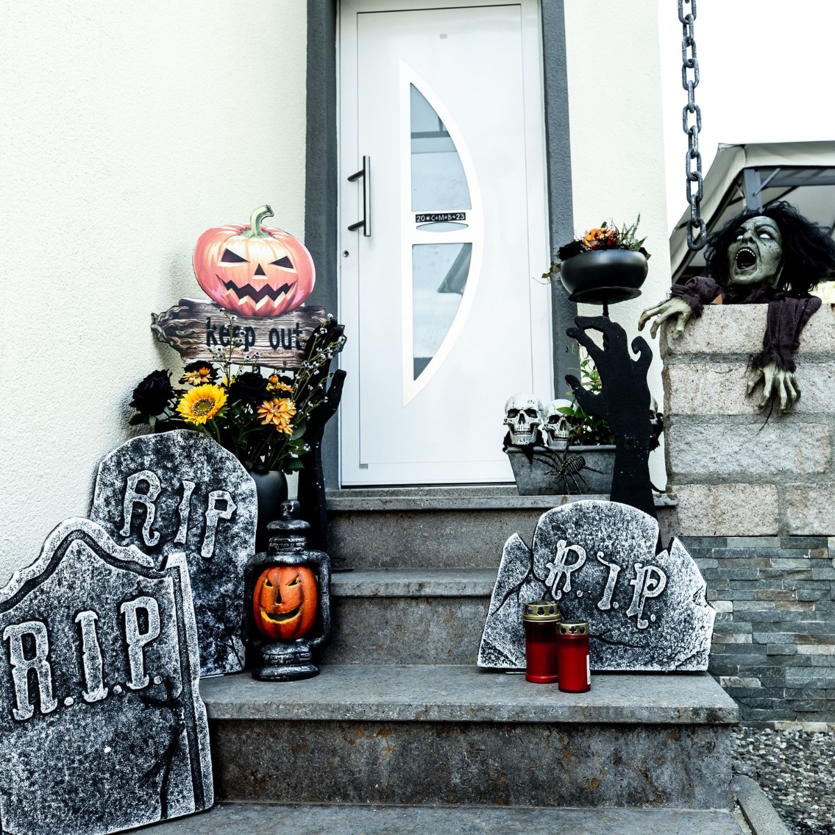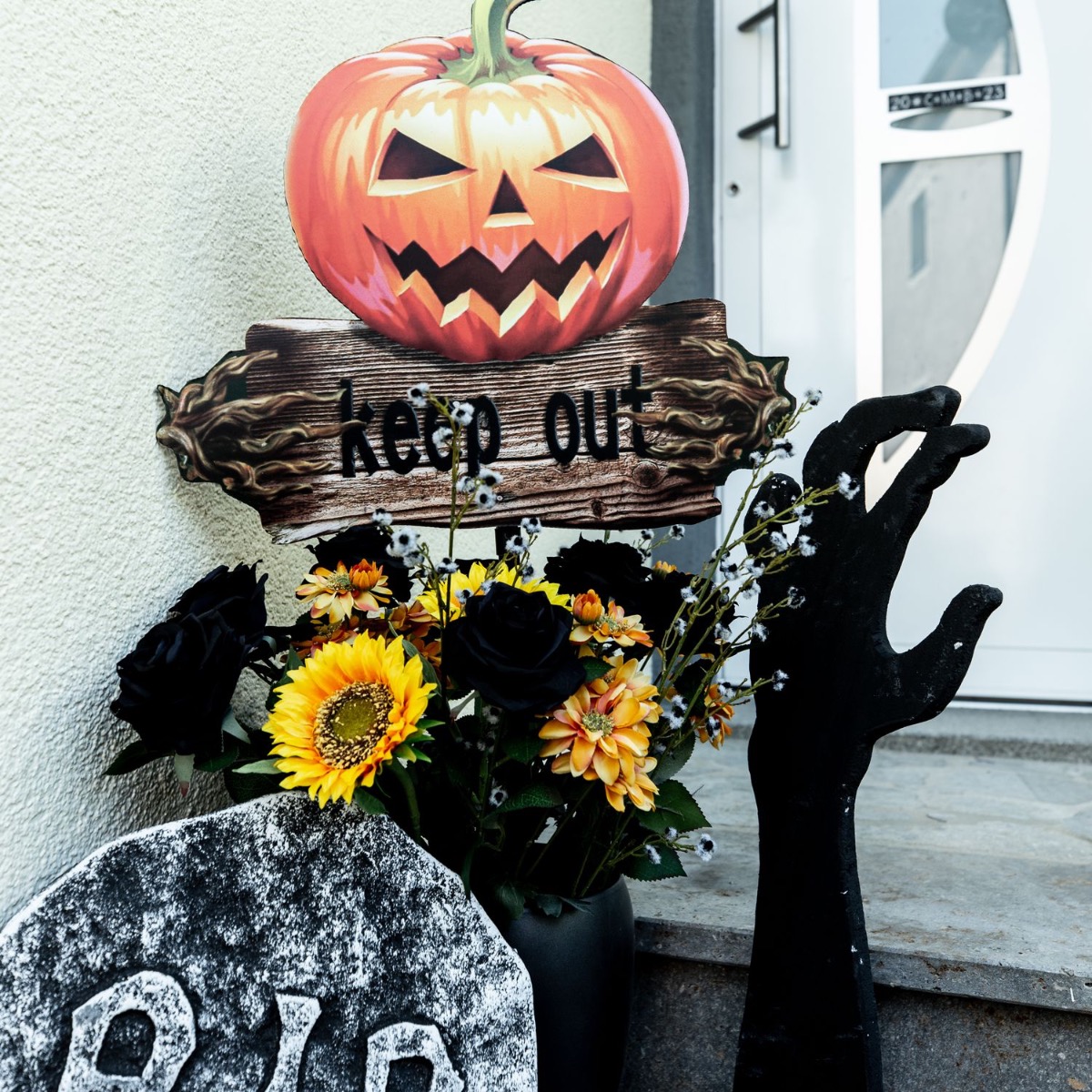 Trick or Treat! What could be better than screaming children demanding sweets on your doorstep? Well, let's give them a good scare. Our styrofoam tombstones and hands already have a really high creep factor, but the illuminated skulls that you can put in plant pots are also really scary. A bouquet of black roses and sunflowers should never be missing from artplants looks. After all, flowers embellish even the scariest places. Shop the Look!