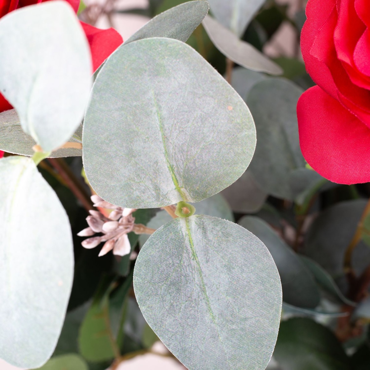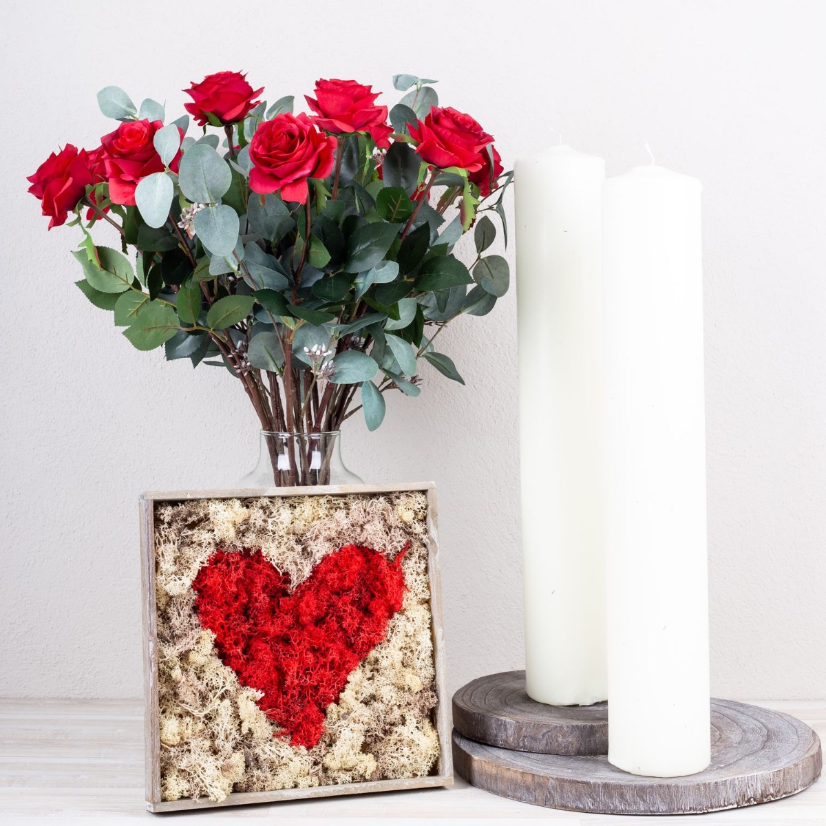 A heart and red roses!’ There is no better declaration of love. The rose bouquet consists of 12 long-stemmed textile roses in an apothecary-style glass vase. The eucalyptus branches add a fresh touch of colour to the bouquet. Our DIY heart made from natural moss is not only beautiful to look at on Valentine's Day or Mother's Day. It is a daily reminder of the love and affection of the giver. Two large, white floor candles create a romantic atmosphere for a long time. It will easily last until Christmas. Shop the Look!