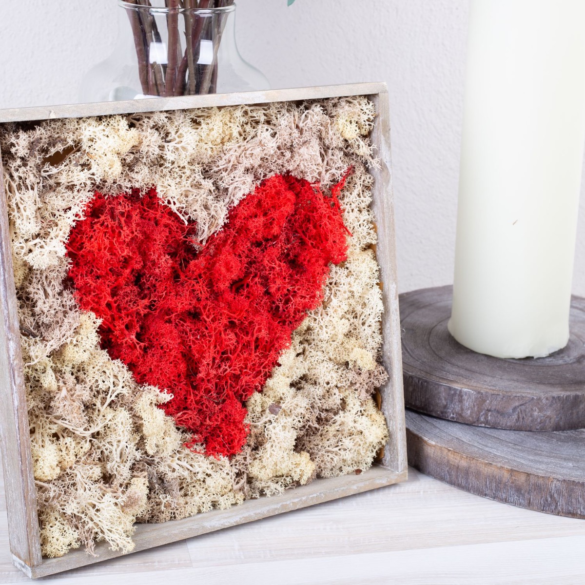 Design tip: Bend the roses slightly and tie into a bouquet. Shorten to vase size if necessary. You will need a hot glue gun for the heart made of natural moss. Start with the heart and glue the red natural moss in the shape of a heart onto the wooden tray, which has been converted into a picture frame. The outline of the heart can be a little imprecise to create a natural effect. Once you are happy with the heart shape, fill the rest of the wooden frame with the second colour of moss.