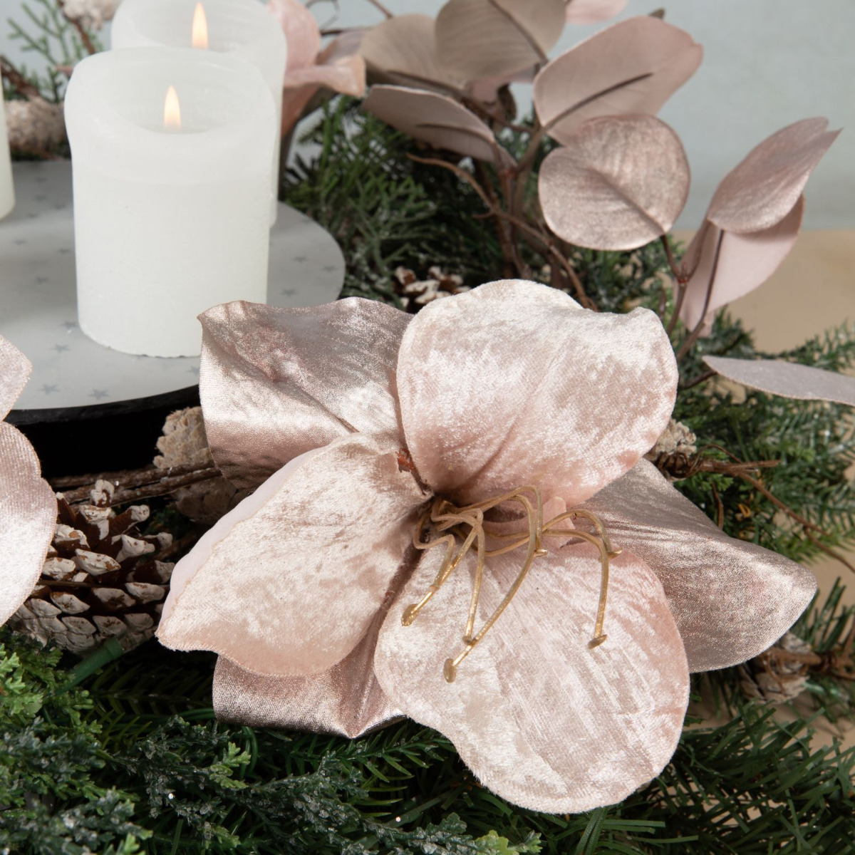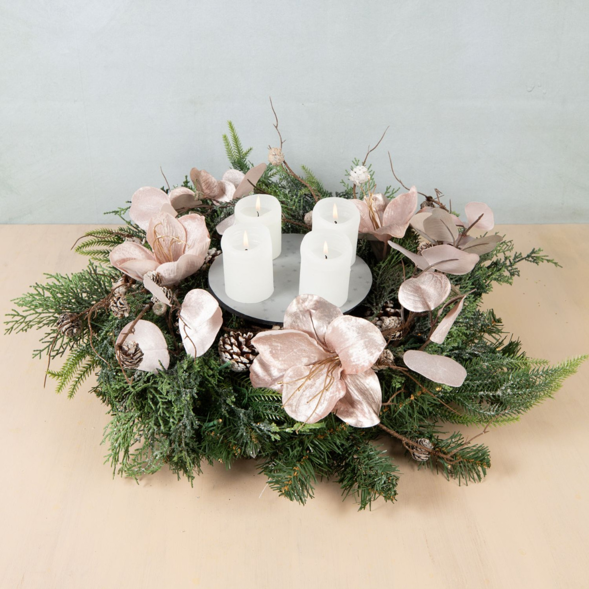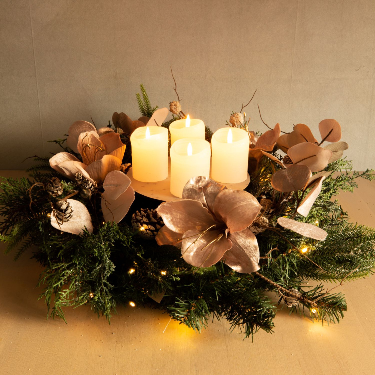 Traditional and modern!This Advent wreath was put together with a lot of love and attention to detail. The fir branches, pine cones and cypresses of the wreath blend perfectly with the velvety elegance of the amaryllis and the rose-coloured eucalyptus. The modern arrangement of the candles in the centre of the wreath gives the look a whole new appeal. Makes you look forward to Christmas. Shop the Look!