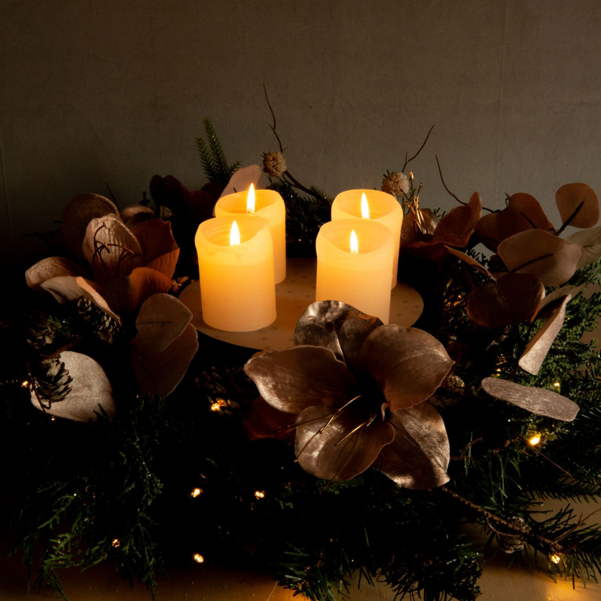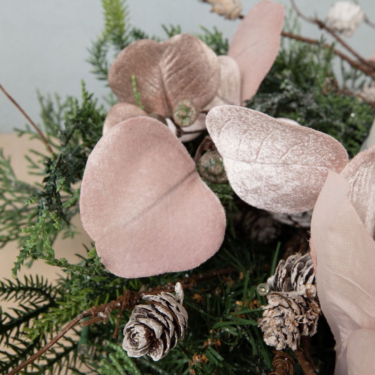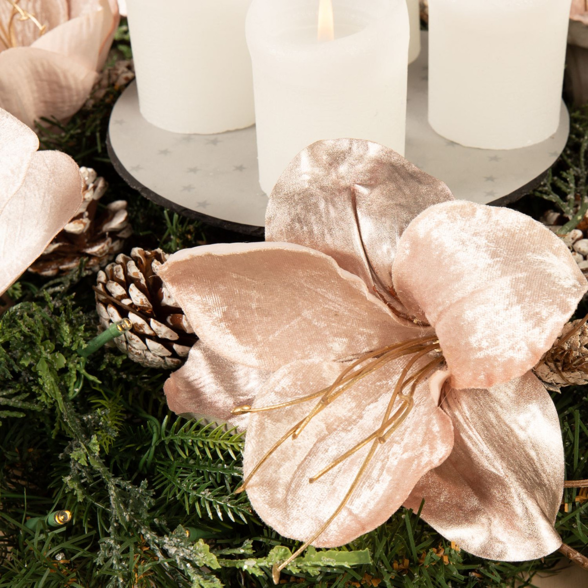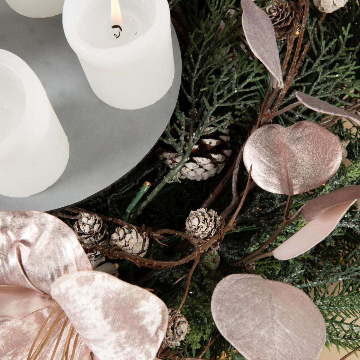 Traditional and modern!This Advent wreath was put together with a lot of love and attention to detail. The fir branches, pine cones and cypresses of the wreath blend perfectly with the velvety elegance of the amaryllis and the rose-coloured eucalyptus. The modern arrangement of the candles in the centre of the wreath gives the look a whole new appeal. Makes you look forward to Christmas. Shop the Look!