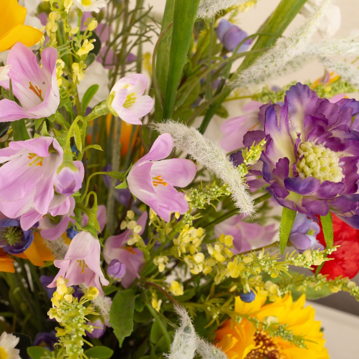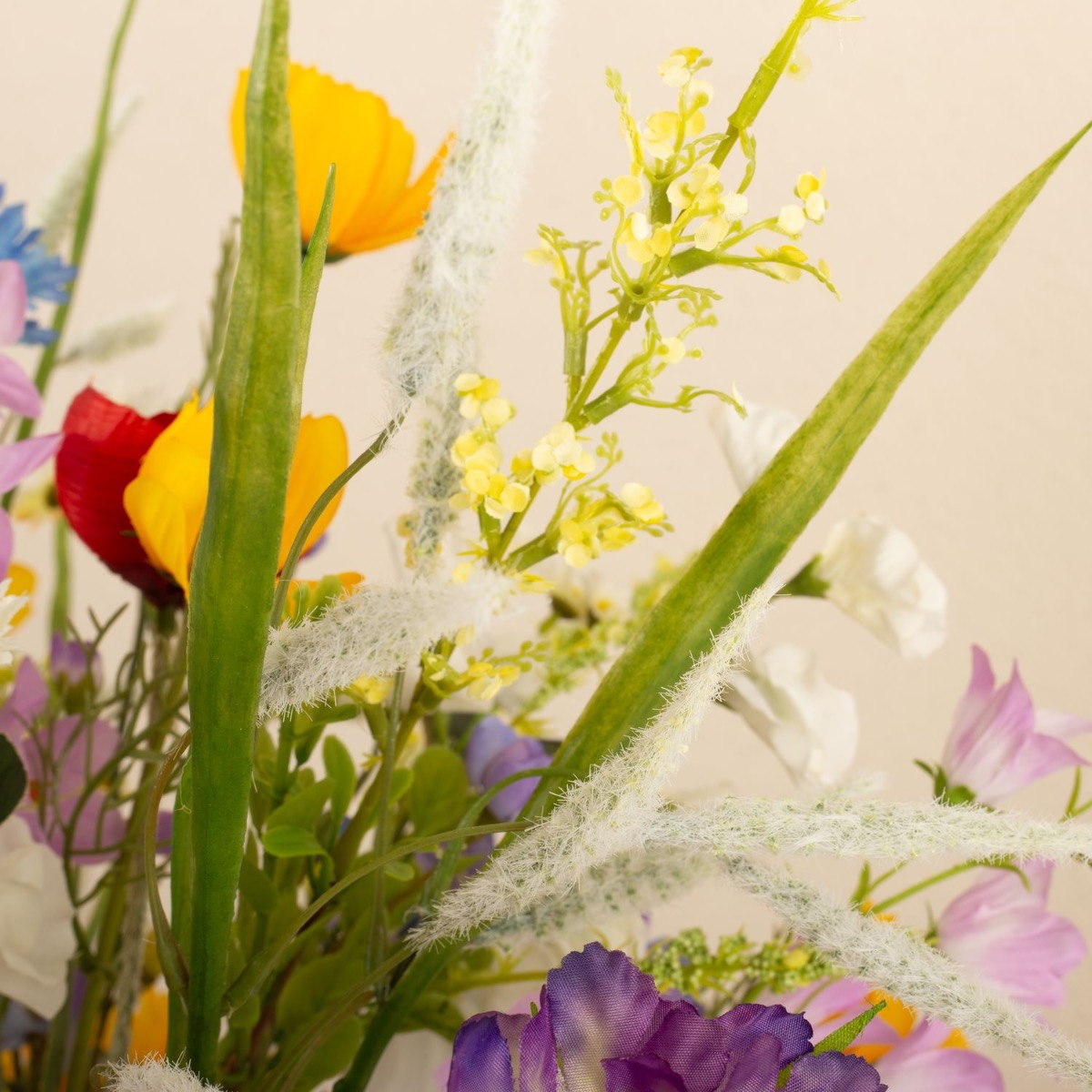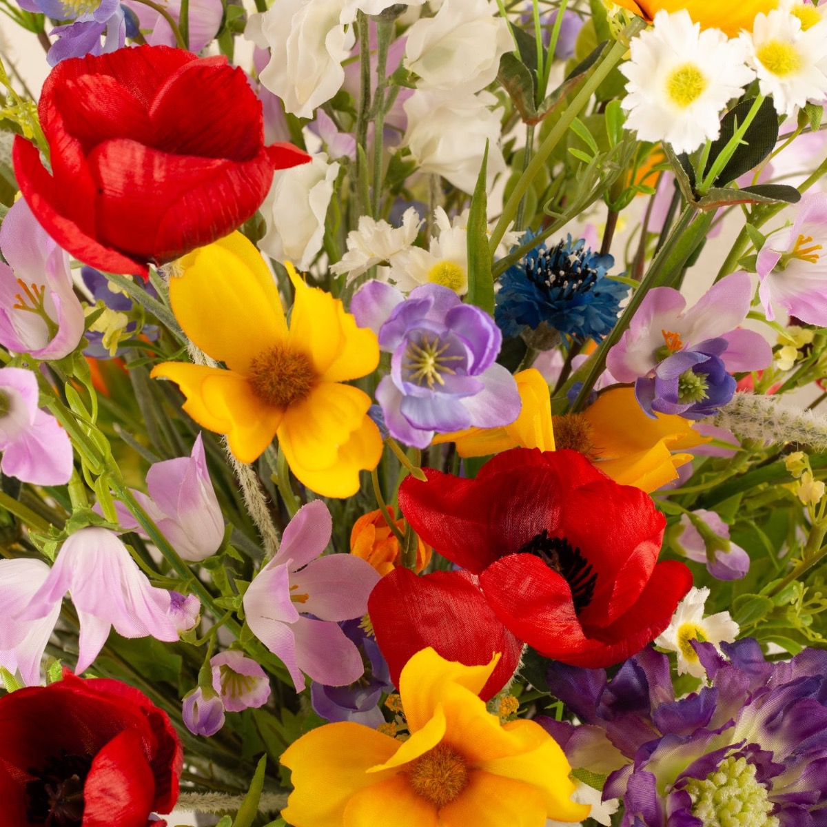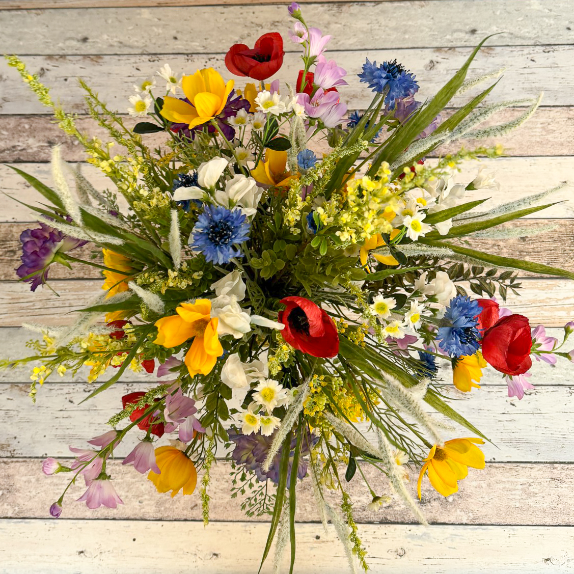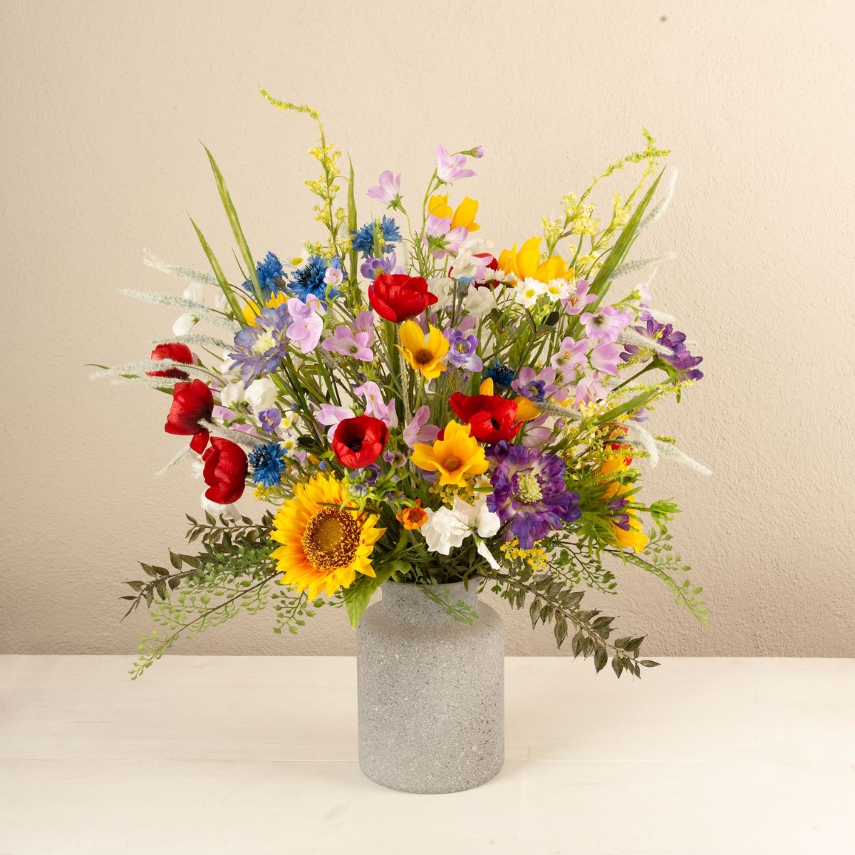 The main thing is colour! Bouquets of meadow flowers are all the rage at the moment! Hartmut had to part with a 30-year-old artificial bouquet and urgently needed a replacement. It could be a little different, but the important thing was that it should be a summery meadow bouquet. A bouquet that looks so real that you can hear the bees buzzing and the insects humming when you look at it. Sunflowers, poppies and cornflowers should definitely be included and convey the glow of a summer flower meadow. Our creative team has done a great job. Shop the Look!