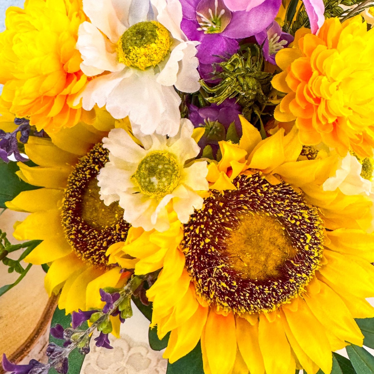 Four candle wreaths: Ready-made rosaries were used for this. We removed the roses and trimmed the stems a little narrower in preparation for re-decorating, so that the new flowers can be attached more easily. We already have some delphinium flowers left over from the bouquet, followed by sunflowers, lavender, chrysanthemums and daisy flowers. We remove all of them from the stems and start sticking them in with the sunflowers, then fill in the gaps with the other flowers, alternating colours. Most of the flowers stay in place on their own, but the rest were fixed with hot glue.