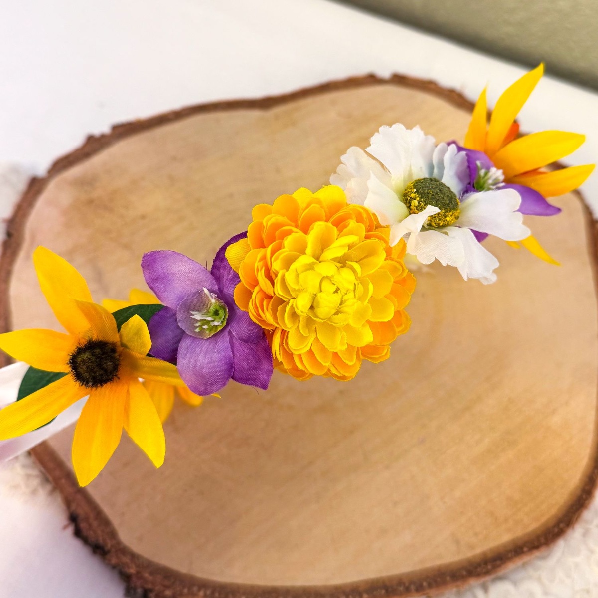 Hairband: First, you will need two white decorative ribbons (different widths) about 1.5 m long. Find the centre point and attach the narrower decorative ribbon to the wide decorative ribbon with a hot glue gun, about 25 cm in each direction. Reinforce the underside of the ribbon with white paper wire, which is also attached with the hot glue gun. For a nice finish and a comfortable fit, cover the paper wire with wide decorative ribbon. About 10 cm of paper wire should still be visible on each side. Now use the flowers and leaves that are not needed from the bouquet and wreaths. You will also need a new chrysanthemum branch and a decorative basket branch. Cut the eucalyptus leaves into smaller pieces, removing the plastic stem from the underside of the leaves. Cut the decorative basket with its large round petals into a sunflower shape by simply cutting the petals into a pointed shape and colouring the pistil with a black pen. The chrysanthemum and daisy flowers consist of several overlapping rings of petals. Remove the largest rings at the bottom to make the flower smaller. You can glue the flower back together with the hot glue gun. Now everything is ready. The ribbon can now be glued to the eucalyptus leaves. Next, decide on the order in which you want the flowers to appear. Start with the middle flower and then alternate between adding another flower to the right and then to the left. Allow everything to dry thoroughly.