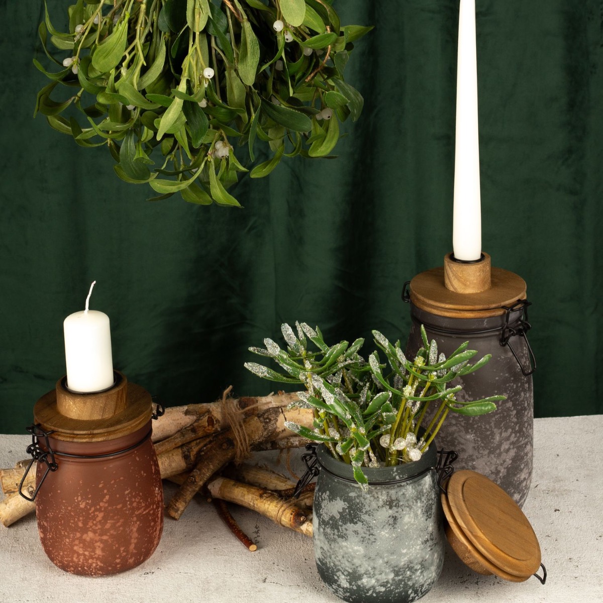 Tradition and shabby chic! Our candle holders in a wintery shabby chic design are perfect for a festive winter decoration. The dual function of these storage jars is particularly practical. Once used as a candle holder and once as a vase for our snowy mistletoe bundles. With this look, we've done some research into the tradition of mistletoe. Mistletoe is one of the few plants that also bloom in winter and has a truly romantic tradition. If a couple kiss under mistletoe, it brings good luck. If a single woman stands under mistletoe, she must not refuse a kiss. So all you single women out there! Shop the look!