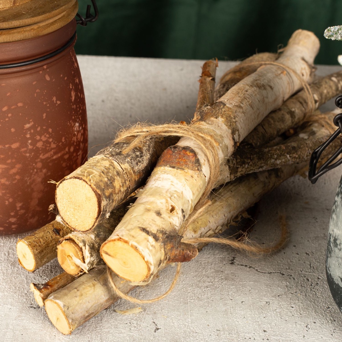 Design tip: Tie the mistletoe branches into a bouquet and hang it from the ceiling in the entrance area. Place candles on the jars and put the small bundles of mistletoe in the open jar.