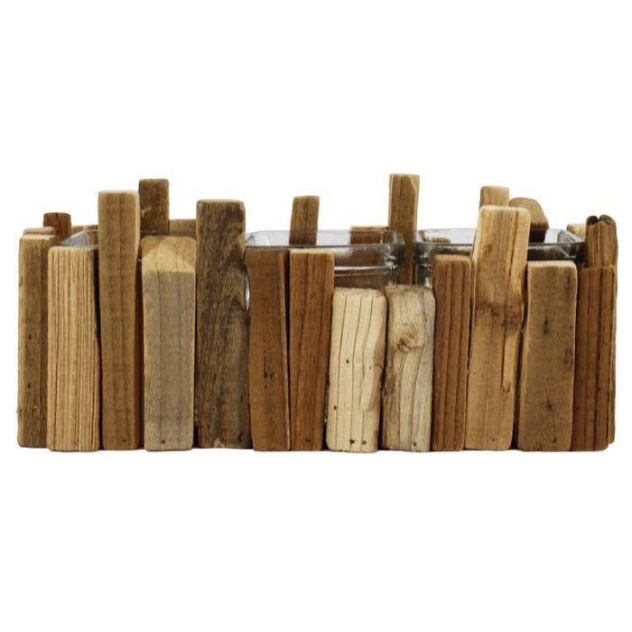 - Comes in a rectangular wooden box made from irregular pieces of wood