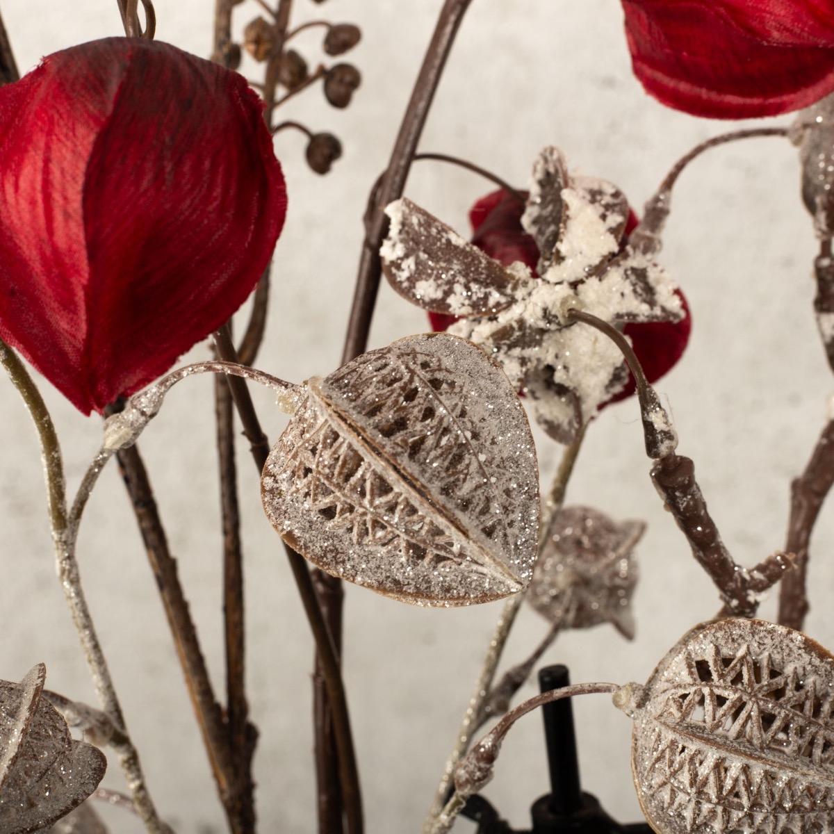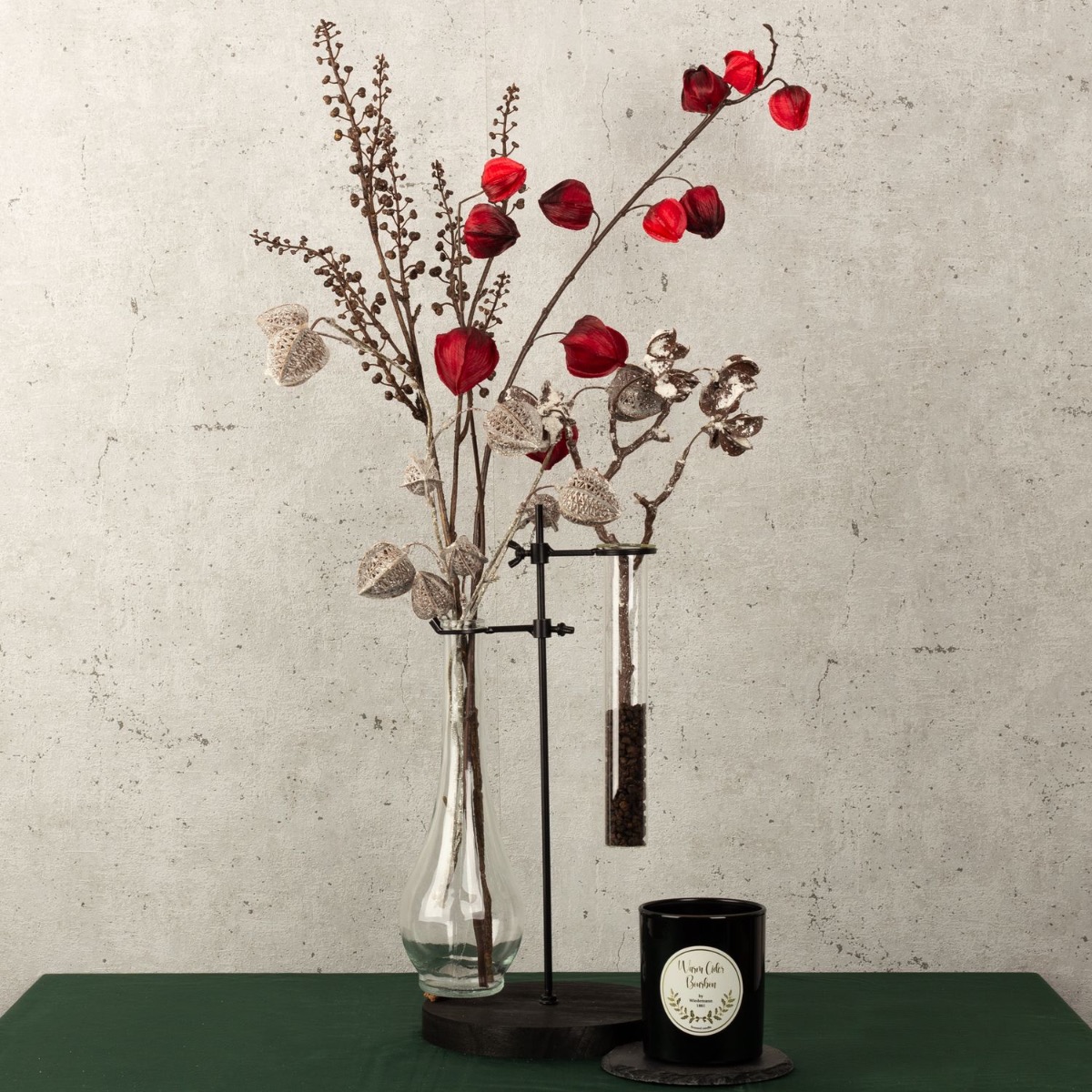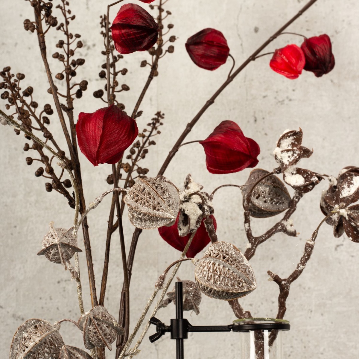 Black, silver and a splash of red! Not everyone likes the overloaded decorations that can be seen everywhere, especially at Christmas time. That's why we've developed a winter look that's restrained, elegant and unusual. Physalis in a winter design and bright red, as well as a snow-covered cotton boll branch adorn this unusual vase in an industrial design. The scented candle also exudes an atypical scent of warm cider. A look for the minimalists among us! Shop the look!