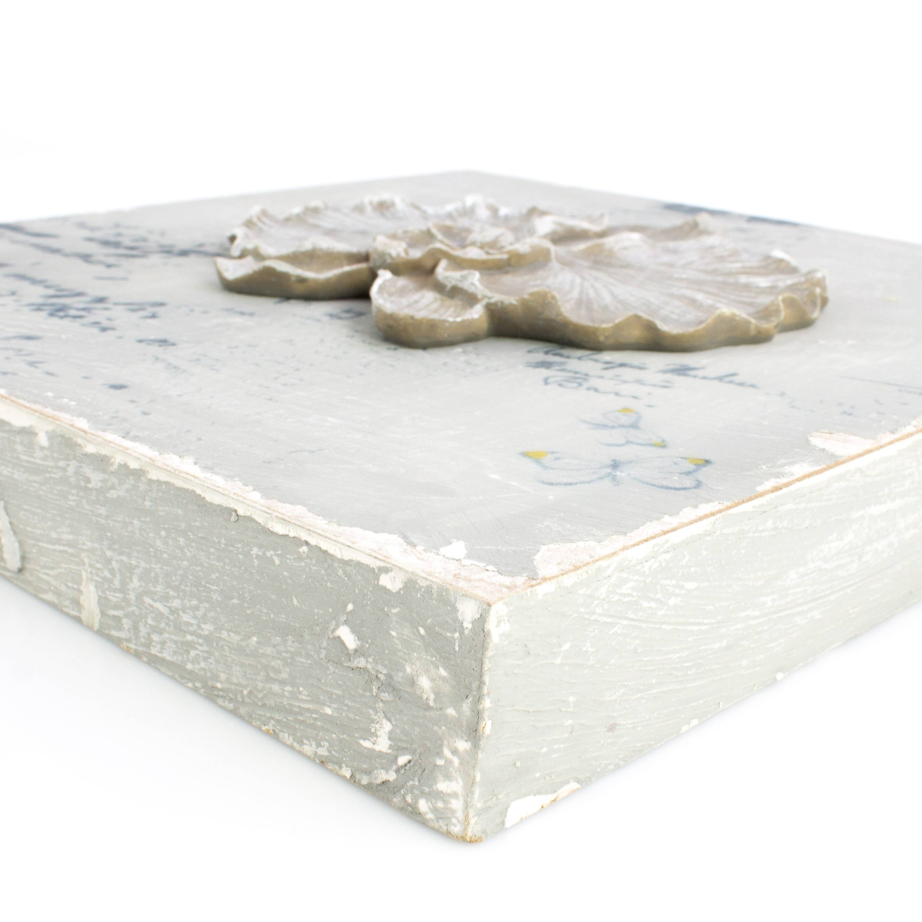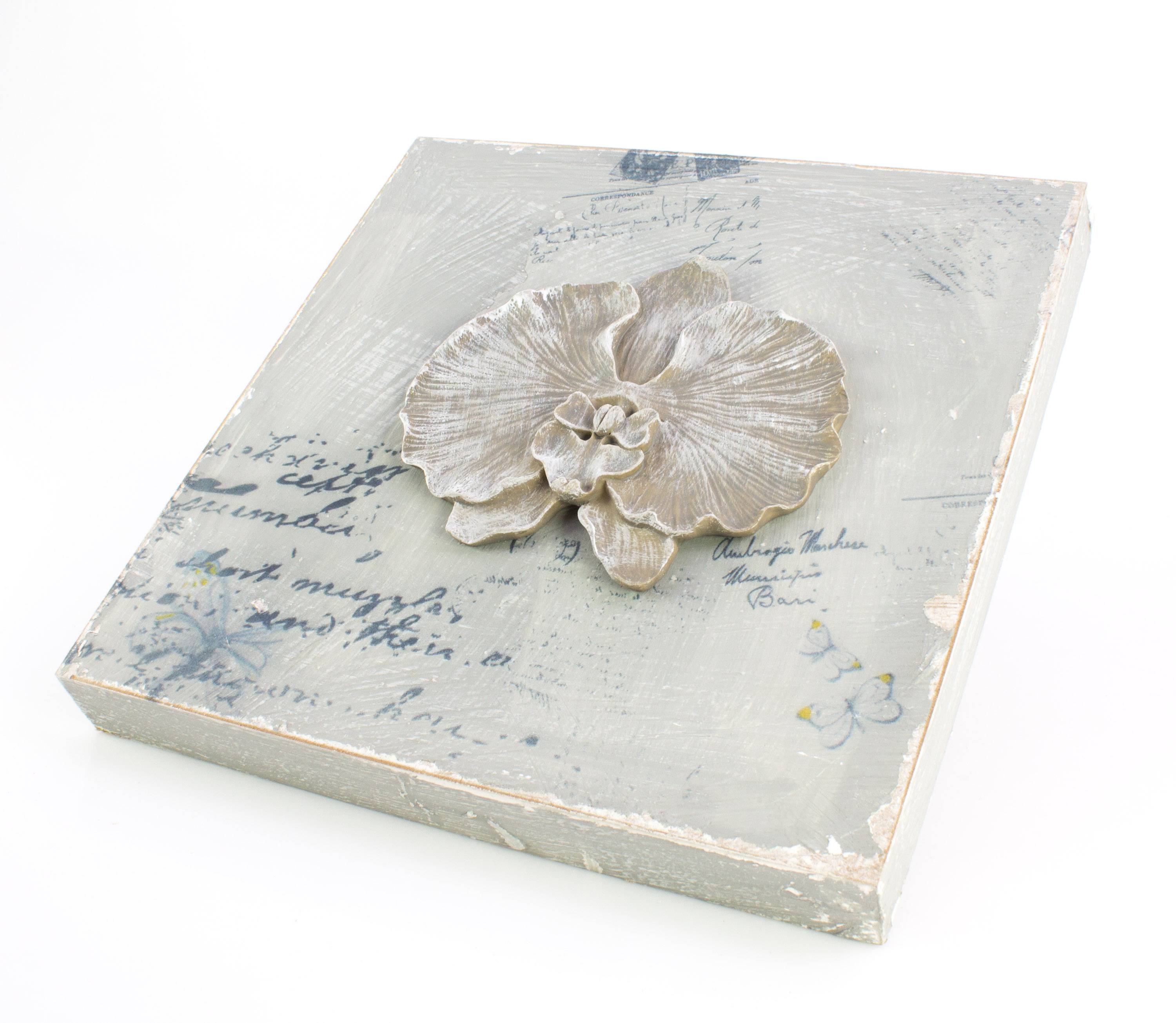 - Back wall made of grey smoothed decorative wood with a large orchid blossom in light grey as well as with letterings and paintings in dark blue, the blossom on top is firmly connected to the back wall, creating a 3D effect