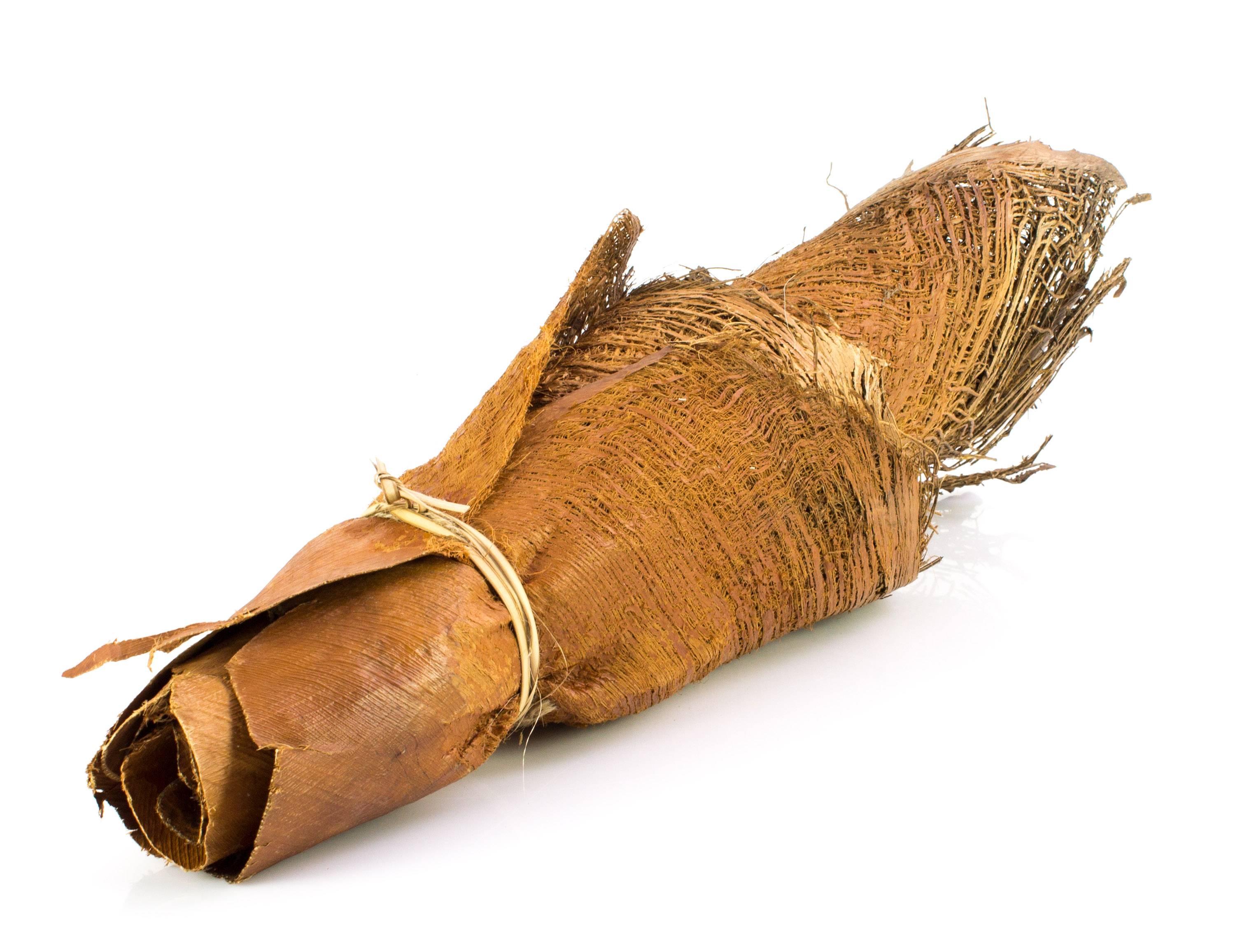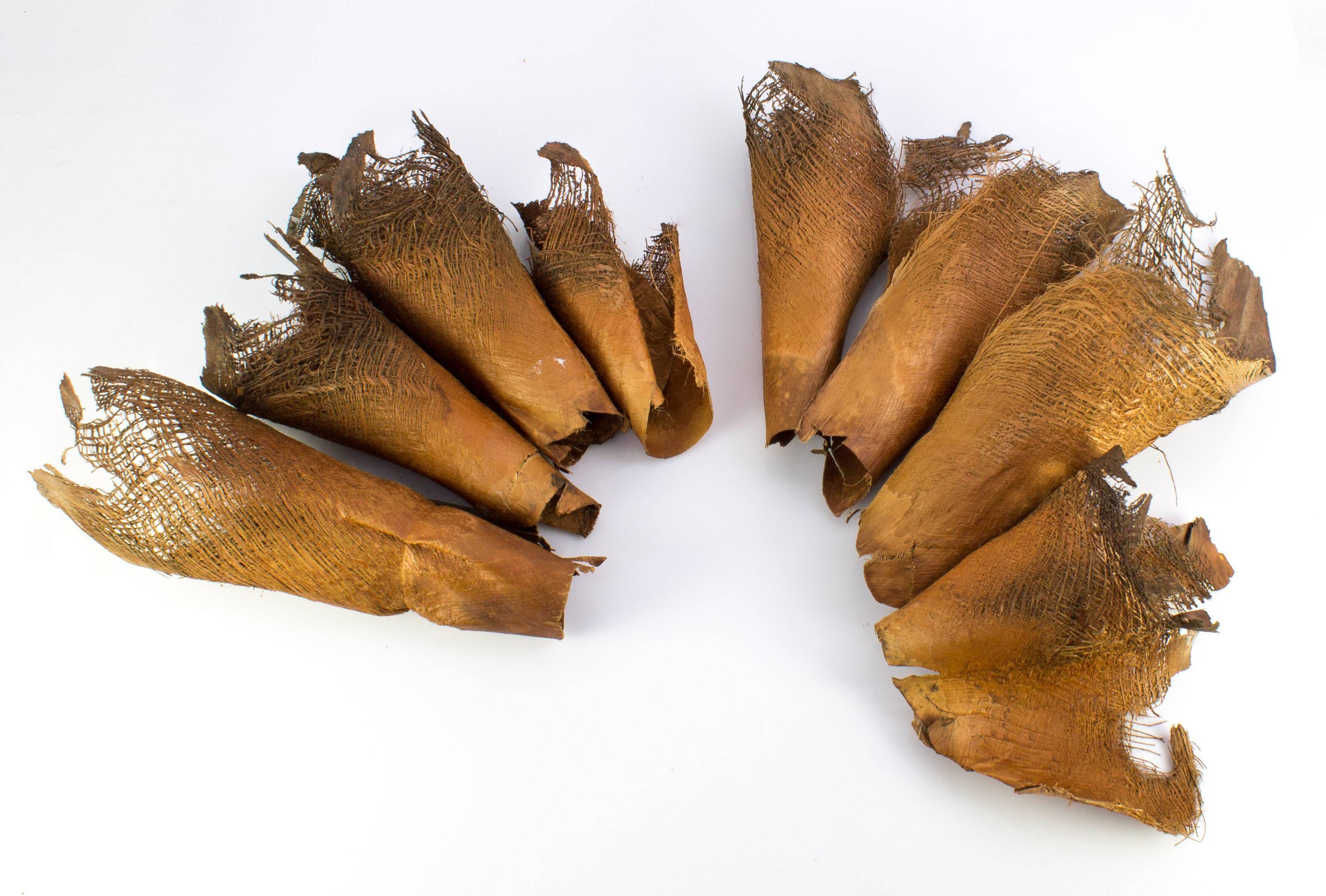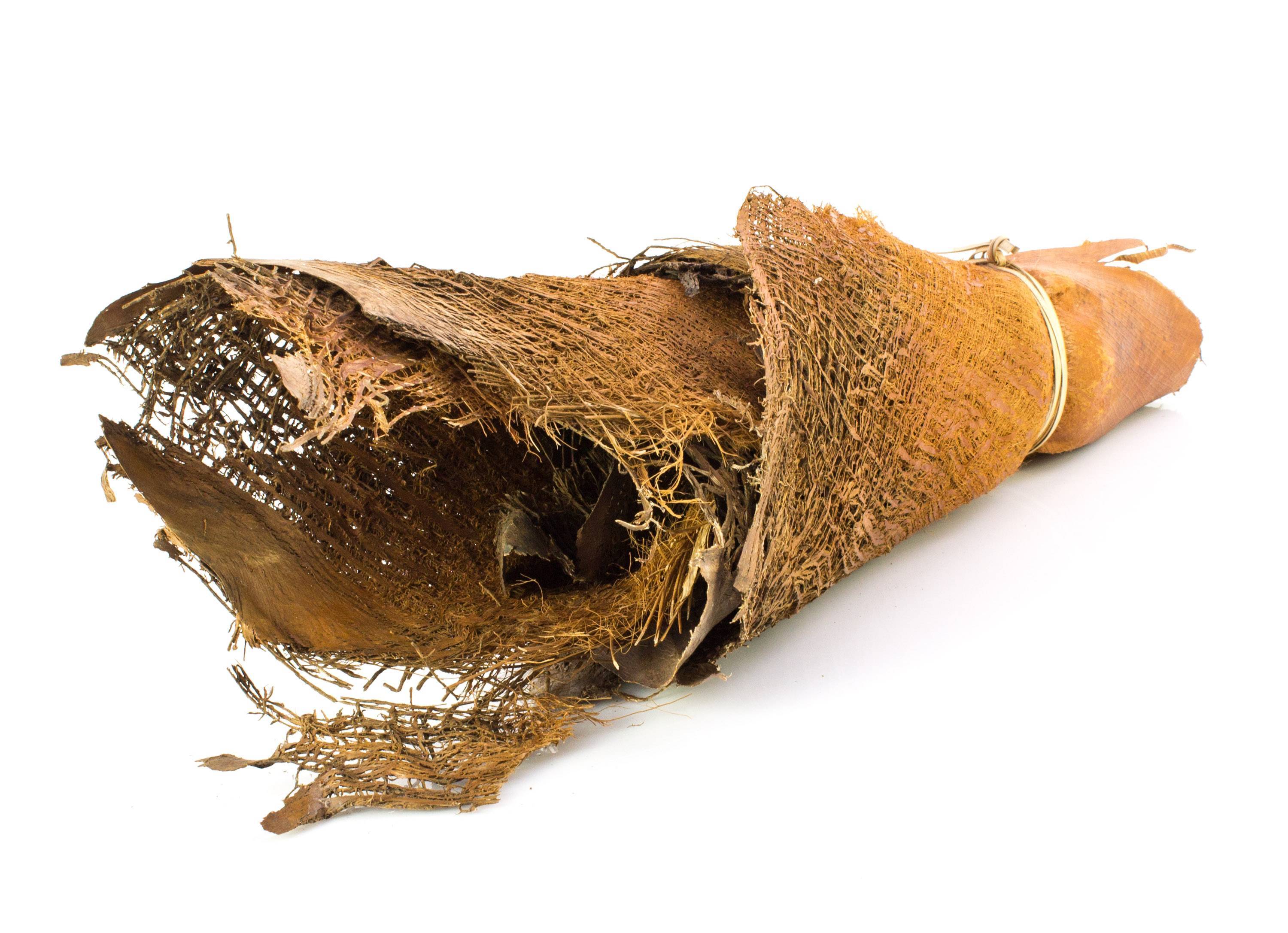 Dried loose pieces of palm fibre material with different sizes from approx. 15 x 15 cm to 30 x 40 cm. The fibre pieces with the beige-brown bark tissue look beautiful as a natural foundation for rewrapping palm trunks.