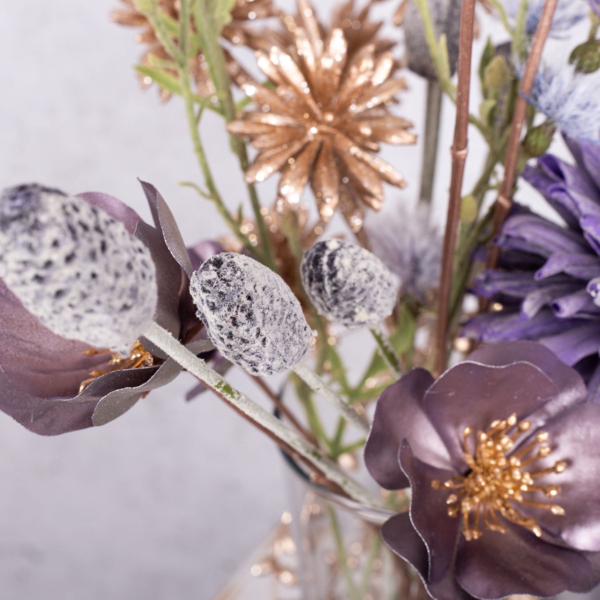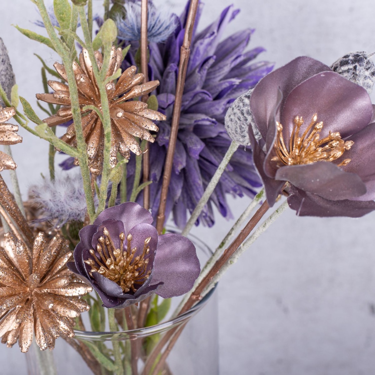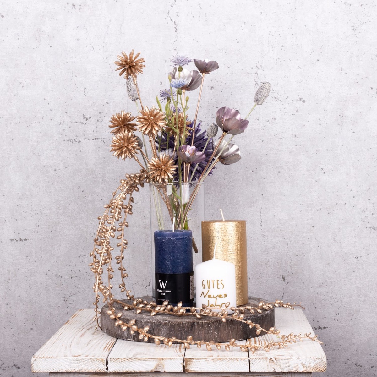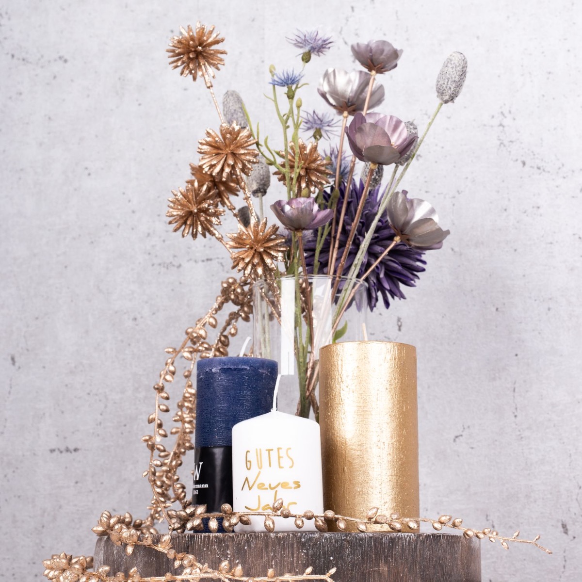 A firework display of gold and purple! A small bouquet of silver and gold flowers that is just high enough for you to be able to talk to the person opposite you makes the perfect table decoration for a New Year's Eve party. Various candles that match the colour of the bouquet are part of every good New Year's Eve party. Golden cornflowers and silvery-purple Christmas roses shimmer beautifully in the candlelight. That immediately creates a good mood. Shop the look!