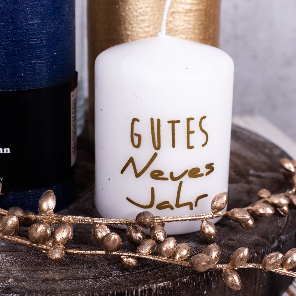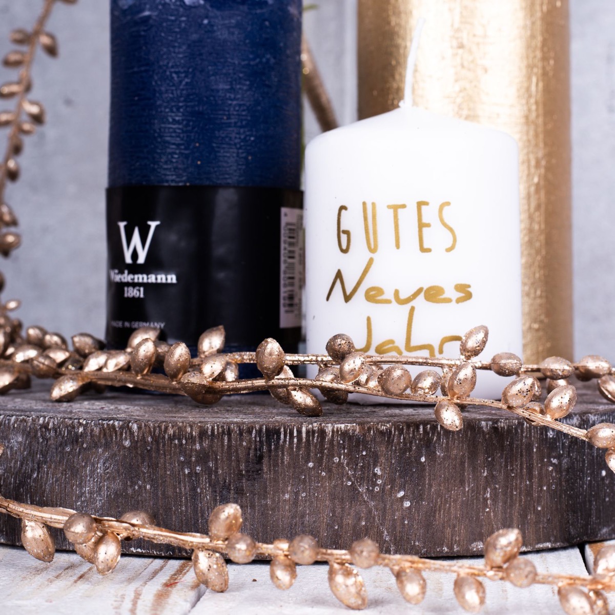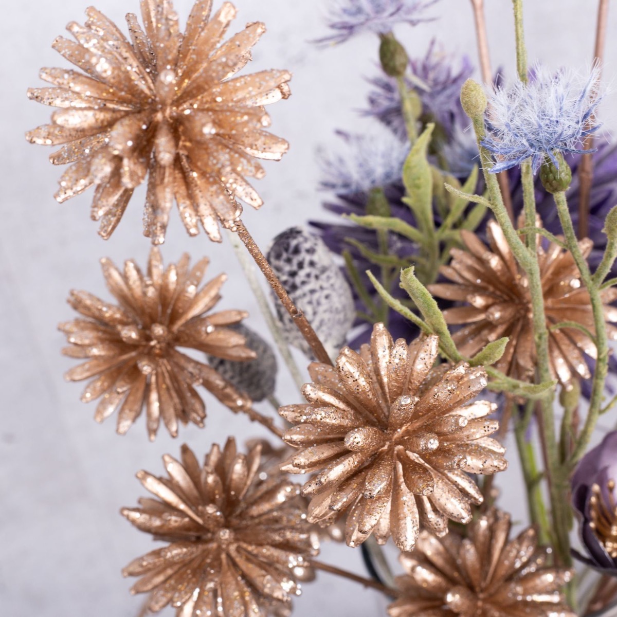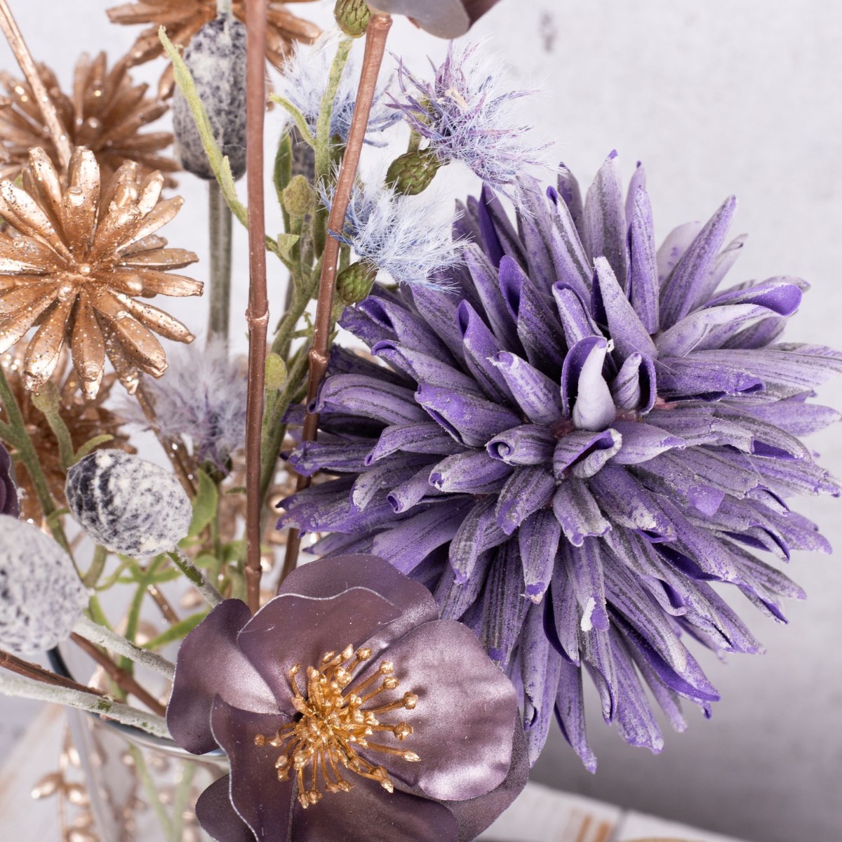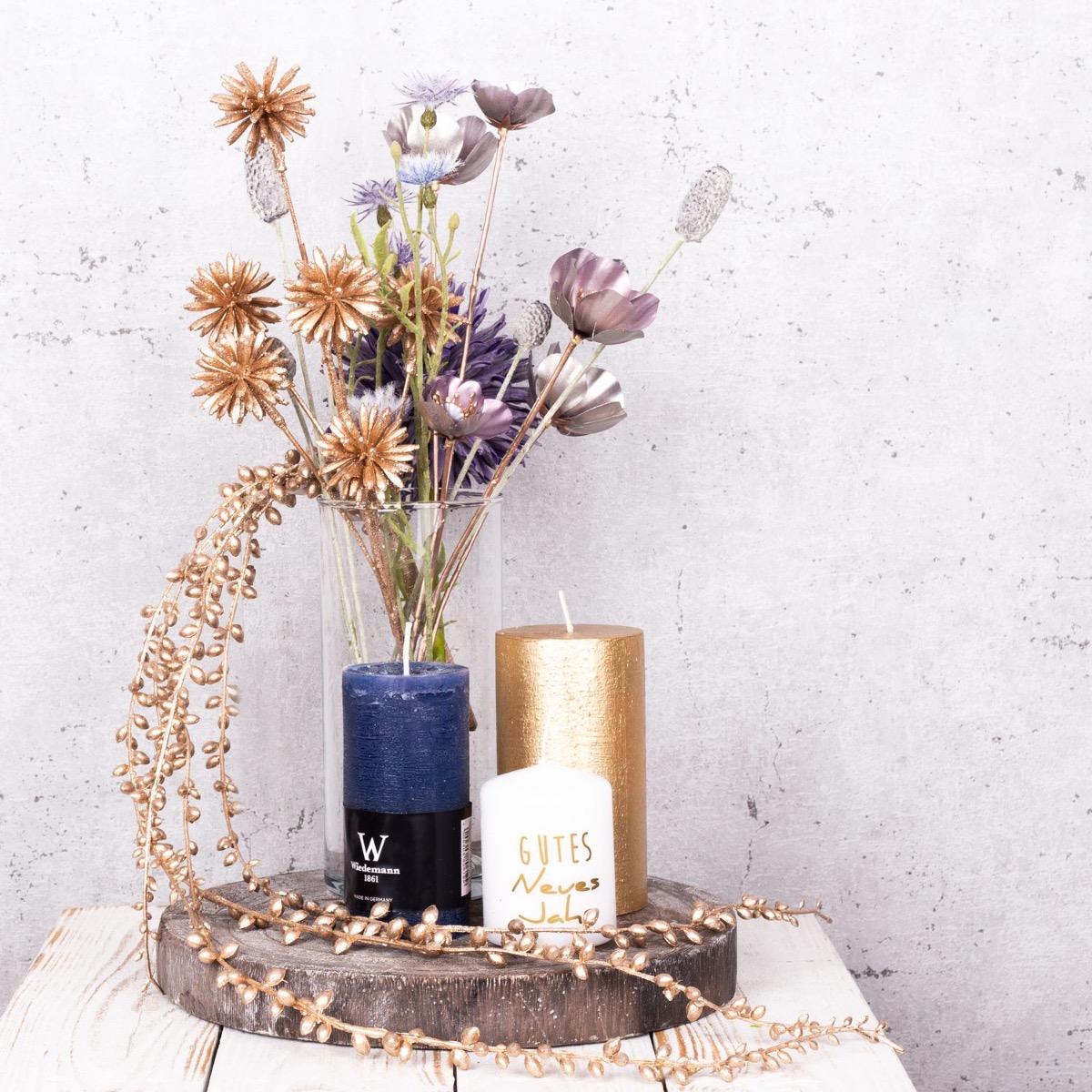 A firework display of gold and purple! A small bouquet of silver and gold flowers that is just high enough for you to be able to talk to the person opposite you makes the perfect table decoration for a New Year's Eve party. Various candles that match the colour of the bouquet are part of every good New Year's Eve party. Golden cornflowers and silvery-purple Christmas roses shimmer beautifully in the candlelight. That immediately creates a good mood. Shop the look!