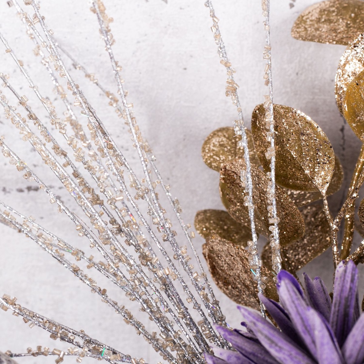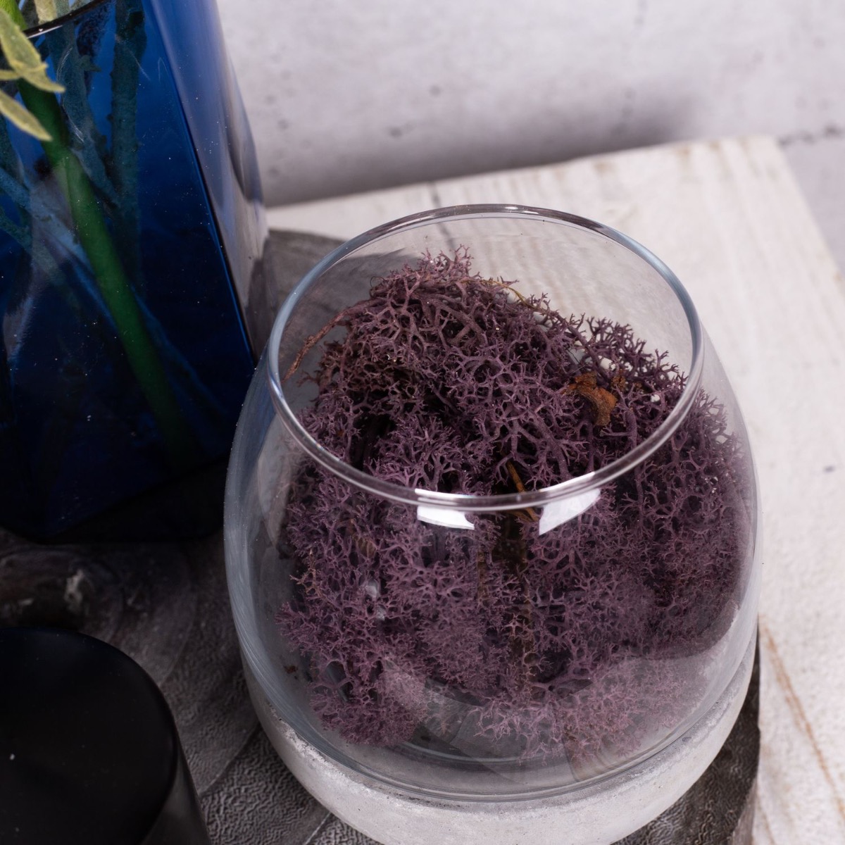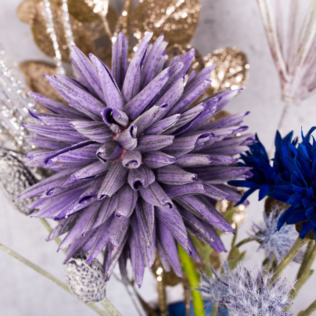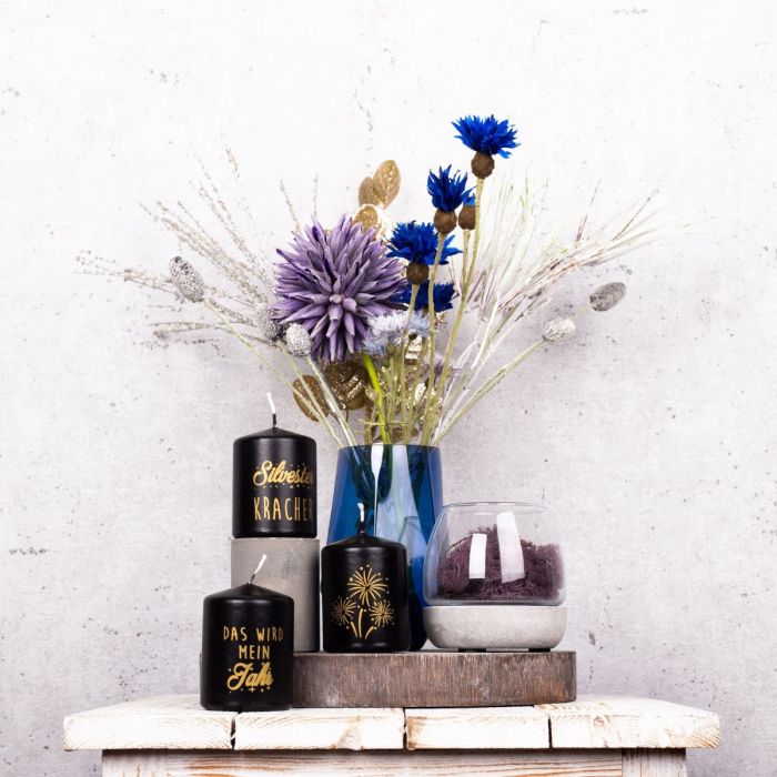 Purple and blue! An atypical colour combination that creates a fresh and colourful winter atmosphere. With the New Year's Eve candles, this look is perfect for a New Year's Eve party to end the year together. The small bouquet of blue cornflowers and a lilac-coloured ornamental leek already looks like a small firework, which is underlined by frosted pine branches and the glittering pine branch. We filled the candle glass with a concrete base with natural moss in a matching colour. Let the party begin. Shop the look!