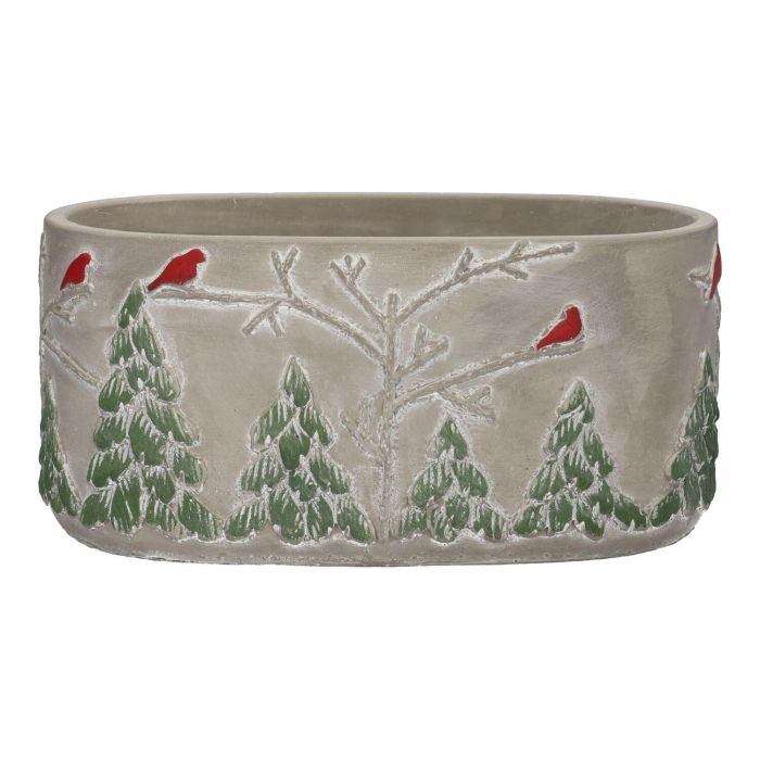 Oval concrete flower bowl MILKE, wintery bird motif, grey-red-green, 8"x4.6"x4"/20,5x11,8x10cm